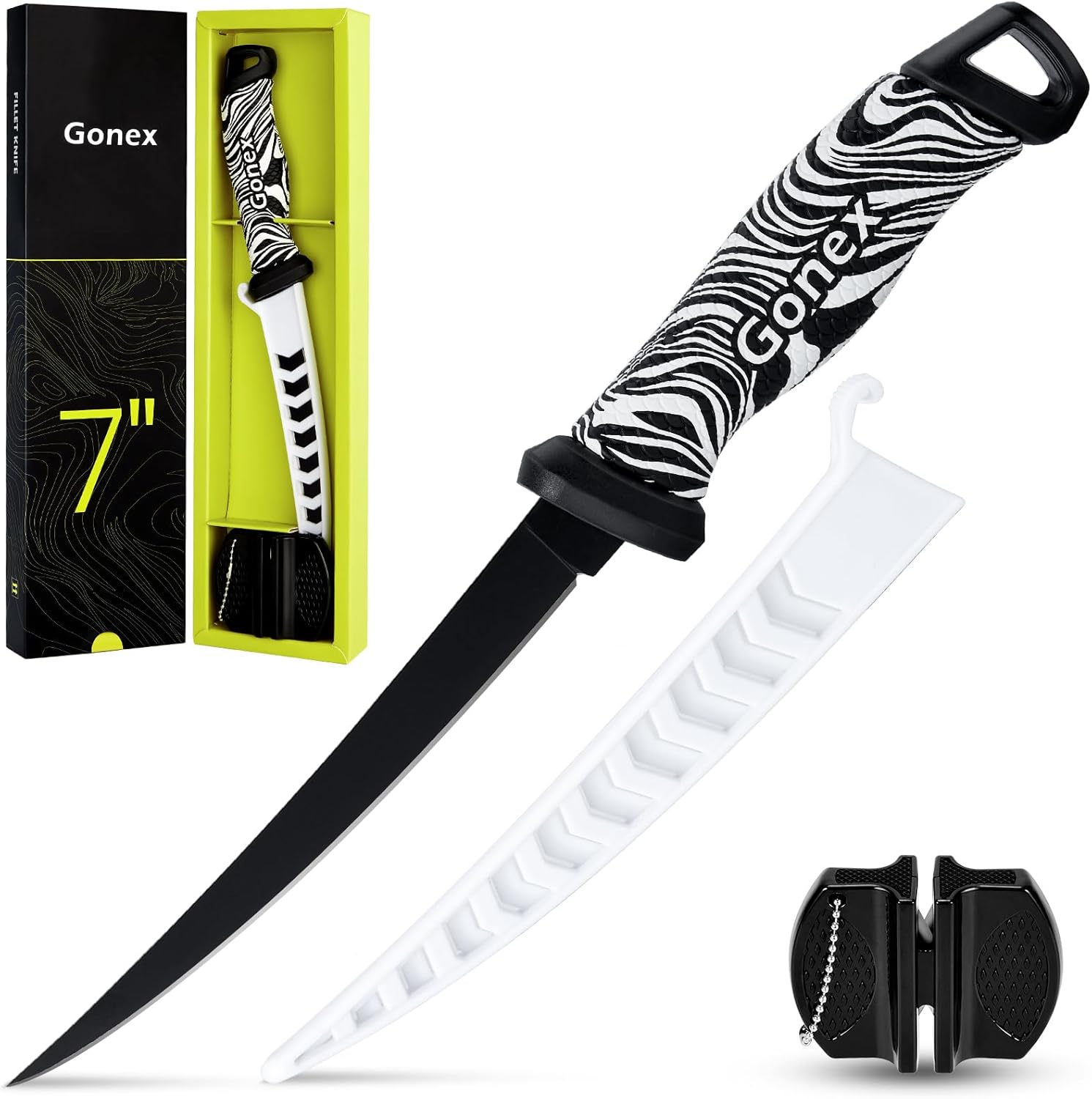 Gonex Fish Fillet Knife Fishing Boning Knives, Fishing Gear Tool Set for Meat Cutting, G4116 German Stainless Steel Blade, Non-Slip Handle, Protective Sheath & 2-Stage Sharpener, 7in