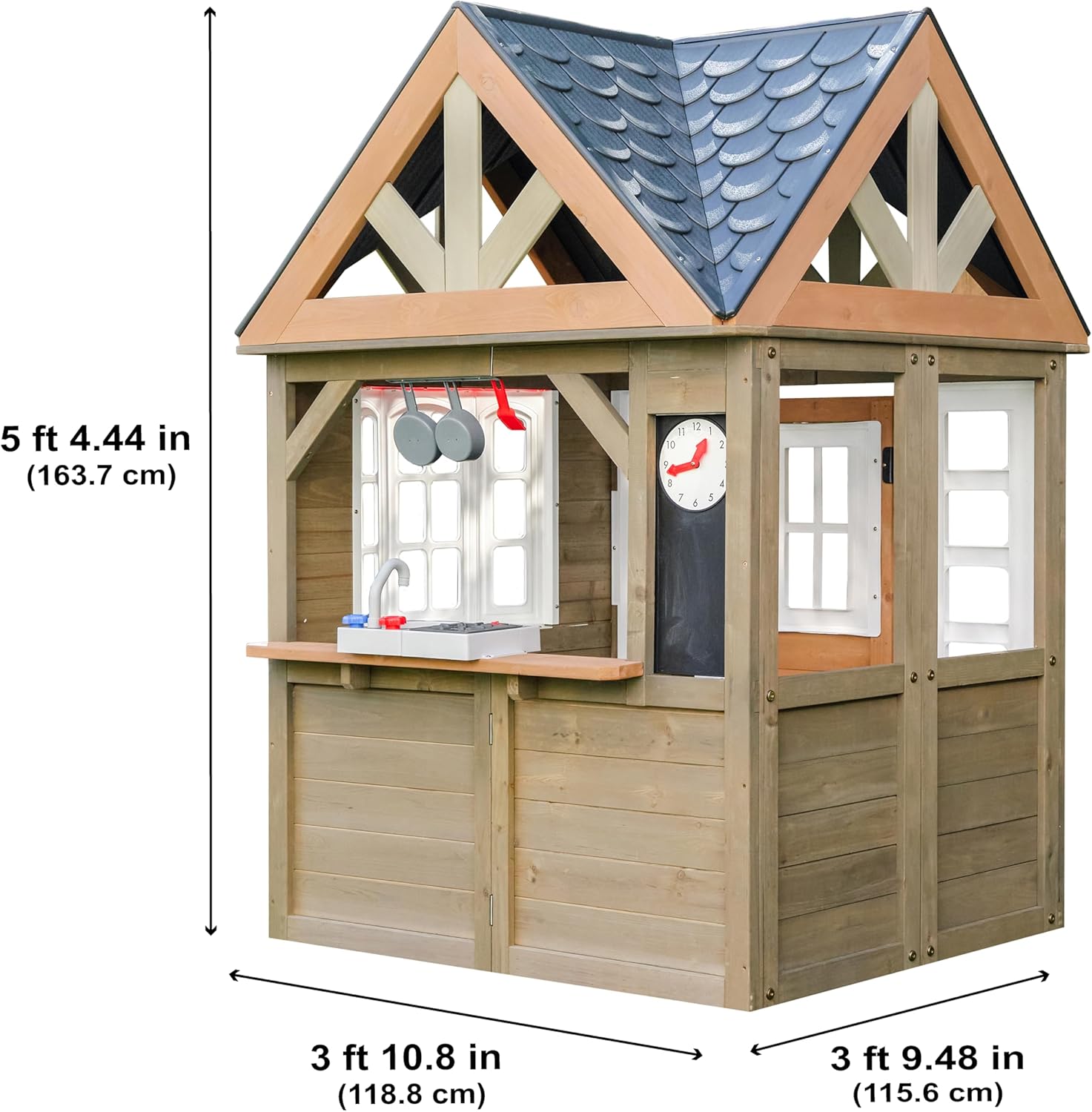Kids can exercise their imaginations in the backyard with the KidKraft Greystone Outdoor Playhouse. Built of premium wood materials, this quaint cottage-style house is ready for years of role playing outside. A real working doorbell chimes the way inside. Open the magnetic-shut door and enter a spacious area set up as a cozy home. A play kitchen and pot, pan and spatula are ready for kids to cook up some meals for family and friends. The open window and ledge make it easy for kids to serve up their food. A bay window sits opposite two more open windows, giving the appearance of a home with the airiness kids need and the visibility parents want to keep an eye on their kids playing. There's a chalkboard and clock with moving hands so boys and girls can practice their writing and time-telling skills. With treated wood and a durable roof, the Greystone Playhouse is equipped to handle all seasons of play.