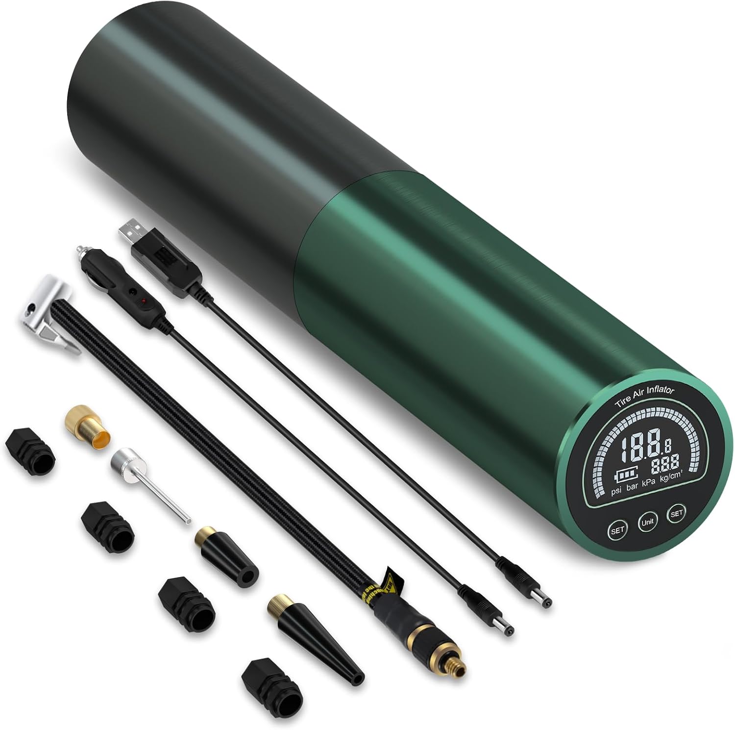 【Cordless Tire Inflator】FC800 portable tire inflator(1.21pounds, 1.6*1.6*9.6in) comes with a cordless rechargeable battery and 12V Cigarette Lighter battery, Brand new motor means that it has more stable performance, Packaging and accessories have also been comprehensively upgraded, 4 Pressure units - PSI, BAR, KPA, KG/CM².