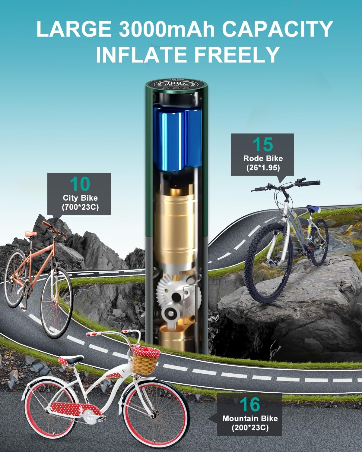 【Powerful Pressure Output】This portable air compressor is rechargeable, It can inflate 3 car tires or 16 bicycle tires or 40 basketball with once simple charge, It provides you with up to 140psi powerful pressure and 20l/min of airflow, which meaning that a bicycle tire can be inflated from 0psi to 50psi within 2 minutes
