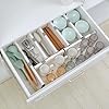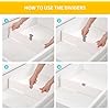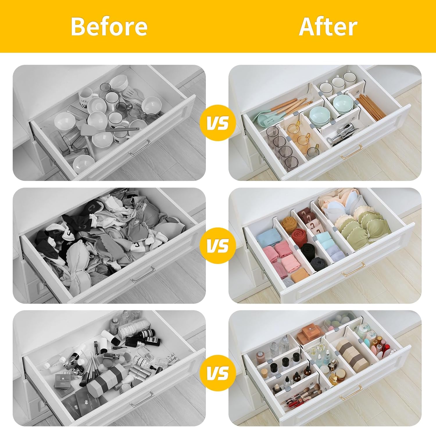 FIT MOST DRAWERS: This set includes 8 drawer separators. Each Measure 10.9"/27.7cm x 1.65"/4.2cm x 4"/10cm high; Expands from 10.9"/27.7cm to 17.2"/43.7cm long. The expandable design fits most drawers. Organize bedroom dresser drawers and nightstands in children, tween, teen and adult bedrooms and closets; They are also perfect for organizing junk drawers, kitchen utensils, office desk supplies, craft and art supplies, bathroom clutter and more.