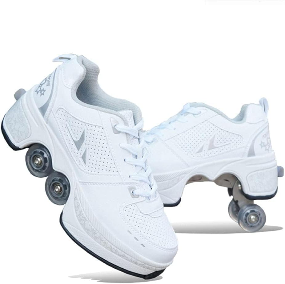 SNEAKER SKATES - Experience convenience with our Roller Skate Shoes. Locate the invisible buttons on the back, adjust them to the upward arrow position, and press firmly to open the wheels. Closing them is just as easy with the same steps.