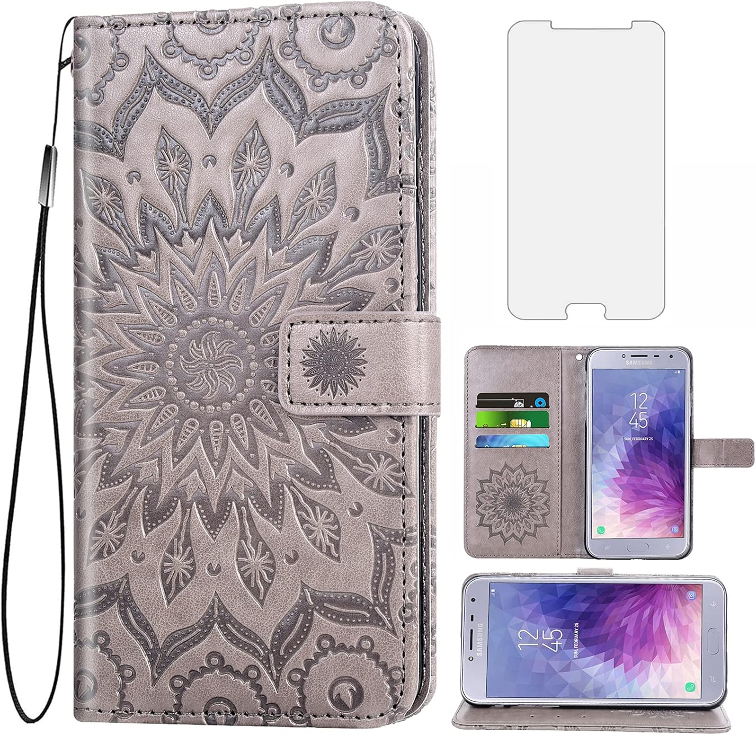 Phone Case for Samsung Galaxy J4 2018 Wallet Cases with Tempered Glass Screen Protector and Sunflower Leather Slim Flip Cover Card Holder Stand Cell Accessories Glaxay J 4 Women Men Gray