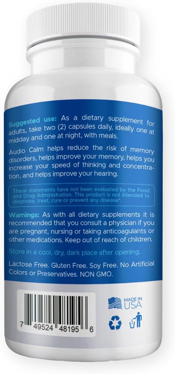 Audio Calm - Alivio del Tinnitus para Zumbidos en los Oídos - Vitaminas para la Salud de los Oídos - Solución Natural para Detener el Tinnitus - Alivio Rápido de Zumbidos en los Oídos, Ruidos y Reducir el Ruido en los Oídos | 60 Cápsulas (1)