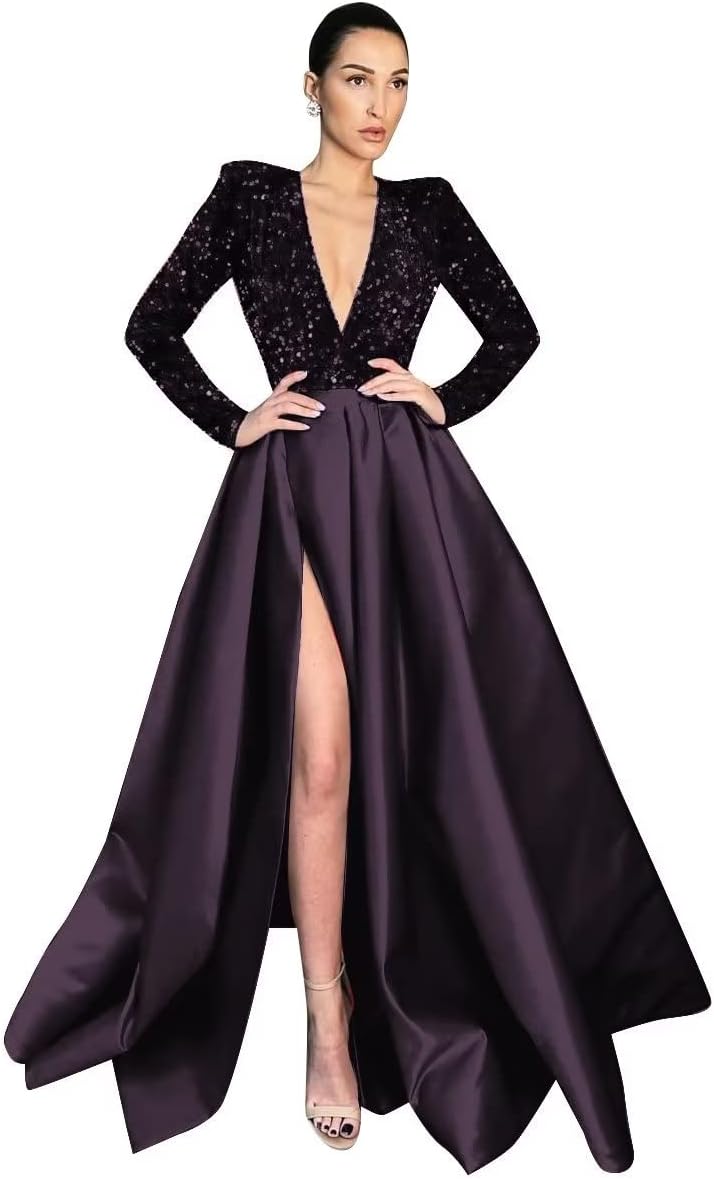 Sequin Prom Dresses Long Sleeve for Women Ball Gown V Neck Satin Formal Evening Gowns with Pockets Plum Size 16