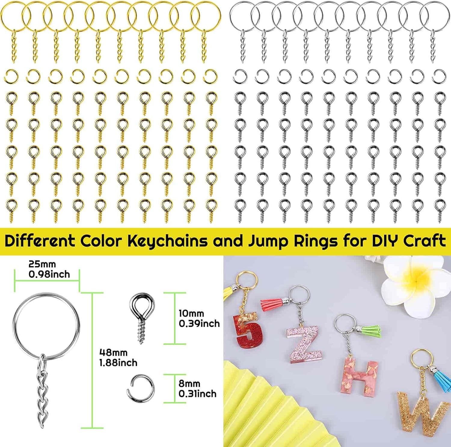 Proporciona 20 llaveros en 2 colores, 20 anillos saltadores y 100 ojos de pinza en 2 colores adecuados para la fabricación de llaveros de resina