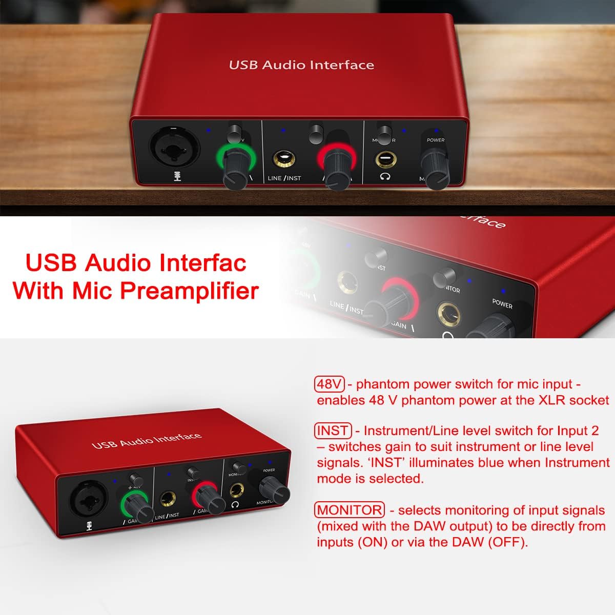 Interfaz de audio USB C Interfaz de audio de grabación de alta definición: 24 bits, 96 kHz, interfaz de audio USB 3.0 2x2. La mejor opción para músicos y podcasters móviles, esta interfaz de audio 2x2 funciona con USB C, es compacta, tiene un diseño robusto y funciona con prácticamente cualquier software de grabación de PC o Mac. Cuenta con preamplificadores de micrófono de clase A de alto rendimiento y convertidores de 24 bits y 96 kHz de calidad profesional para Mac y Windows. Preparación 1. Primero, conecte esta interfaz con el cable USB tipo C incluido en el paquete y conéctela al ordenador (asegúrese de que el puerto USB del ordenador pueda suministrar energía y transmitir datos con normalidad). 2. Ajuste las tres perillas al menos al engranaje intermedio. A continuación, haga clic en las tres teclas táctiles para asegurarse de que todas las funciones estén activadas. 3. Conecta el cable XLR y el cable de los auriculares para iniciar la grabación. NOTA: No se incluye el software de grabación DAW, debe descargar el software de grabación usted mismo. Contenido del paquete: 1 x interfaz de audio USB 1 x cable USB tipo C. 1 x manual de usuario 1 x adaptador USB C a USB.