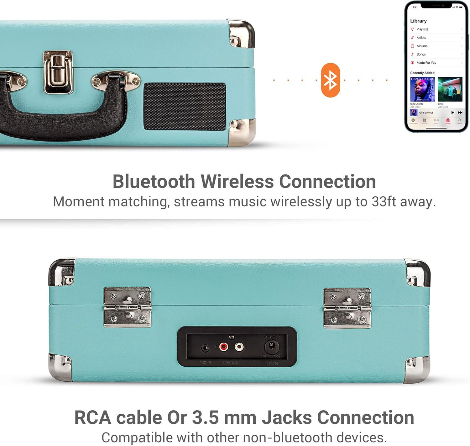 Reproductor de Discos de Vinilo ByronStatics, Giradiscos de 3 Velocidades con Bluetooth, con 2 Altavoces Estéreo Integrados, Aguja de Repuesto, Compatible con Salida RCA, Entrada AUX, Maleta Vintage Portátil - Verde Teja