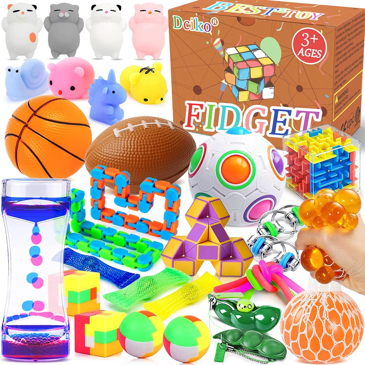 2022 Upgraded Bulk Fidget Toy Set (random color): These fidget packs have 32 pieces in a total of 14 kinds of fidget toys bundle. Includes 1 Liquid Motion Timer, 1 3D Maze Puzzle, 1 Basketball Stress Ball, 1 Football Stress Ball, 1 Rainbow Magic Ball, 8 Animal Mochi Squishy Toys, 2 Snake Cubes, 1 Mesh Stress Ball, 2 Flippy Chains, 2 Wacky Tracks, 3 Stretchy String Fidgets, 2 Squeeze Beans, 3 Marble and Meshes, 4 Puzzle Balls.
