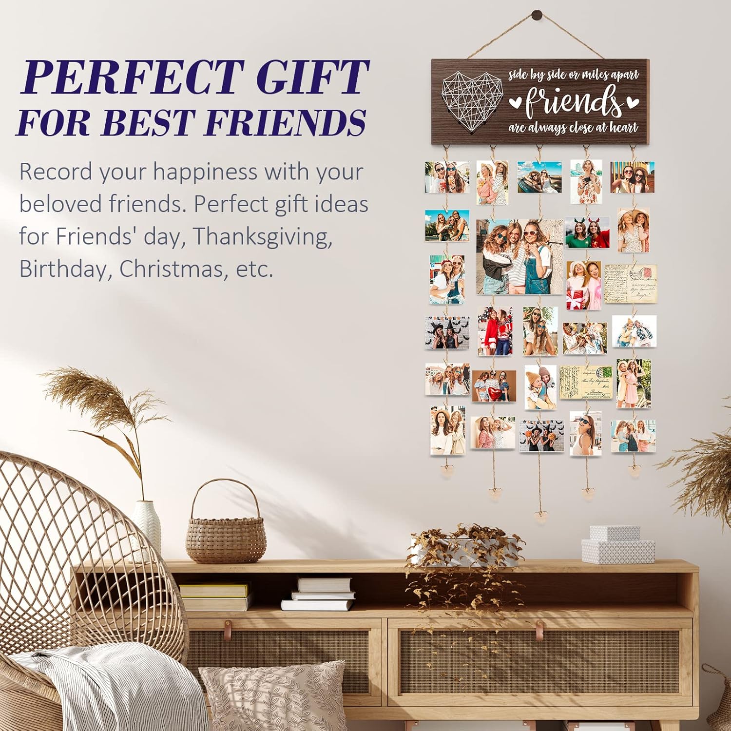 VIVID & READABLE PRINTING: Unlike other model with unreadable gaped out words in the market, our best friend photo holder’s printing is vivid & clear, no cutting words for easy reading. This exquisite BFF Gifts wood hanging photo display frame board for wall decor is carefully designed to hang photos of cherished moments with 30 Clips(other models only offer 12 Clips), making it a gallery of memories. Whether you are miles apart or side by side, this board unites you every time you look at it.