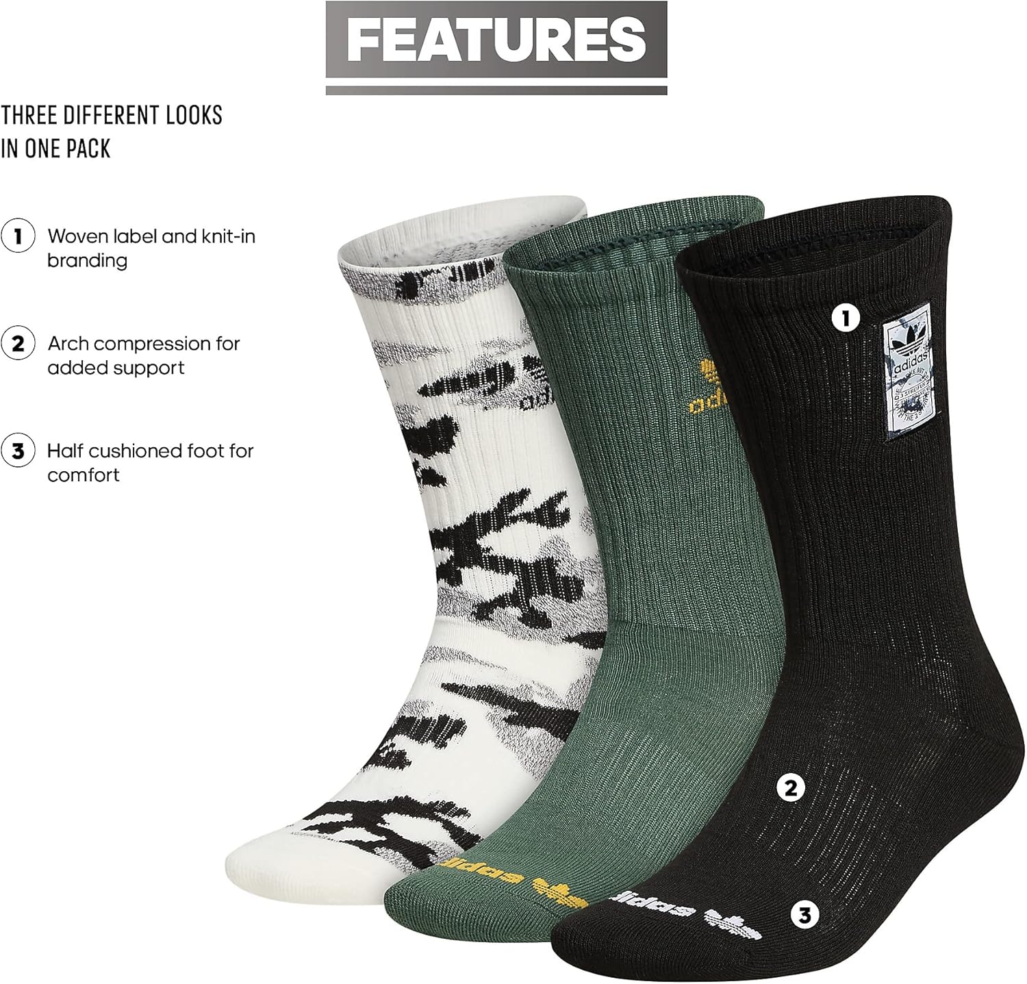 Estos calcetines de manga larga de adidas añaden un estilo utilitario a cualquier look. El paquete de tres ofrece tres looks diferentes, incluyendo un par con estampado de camuflaje completo. Un forro medio acolchado y una compresión de arco incorporada proporcionan comodidad durante todo el día.
