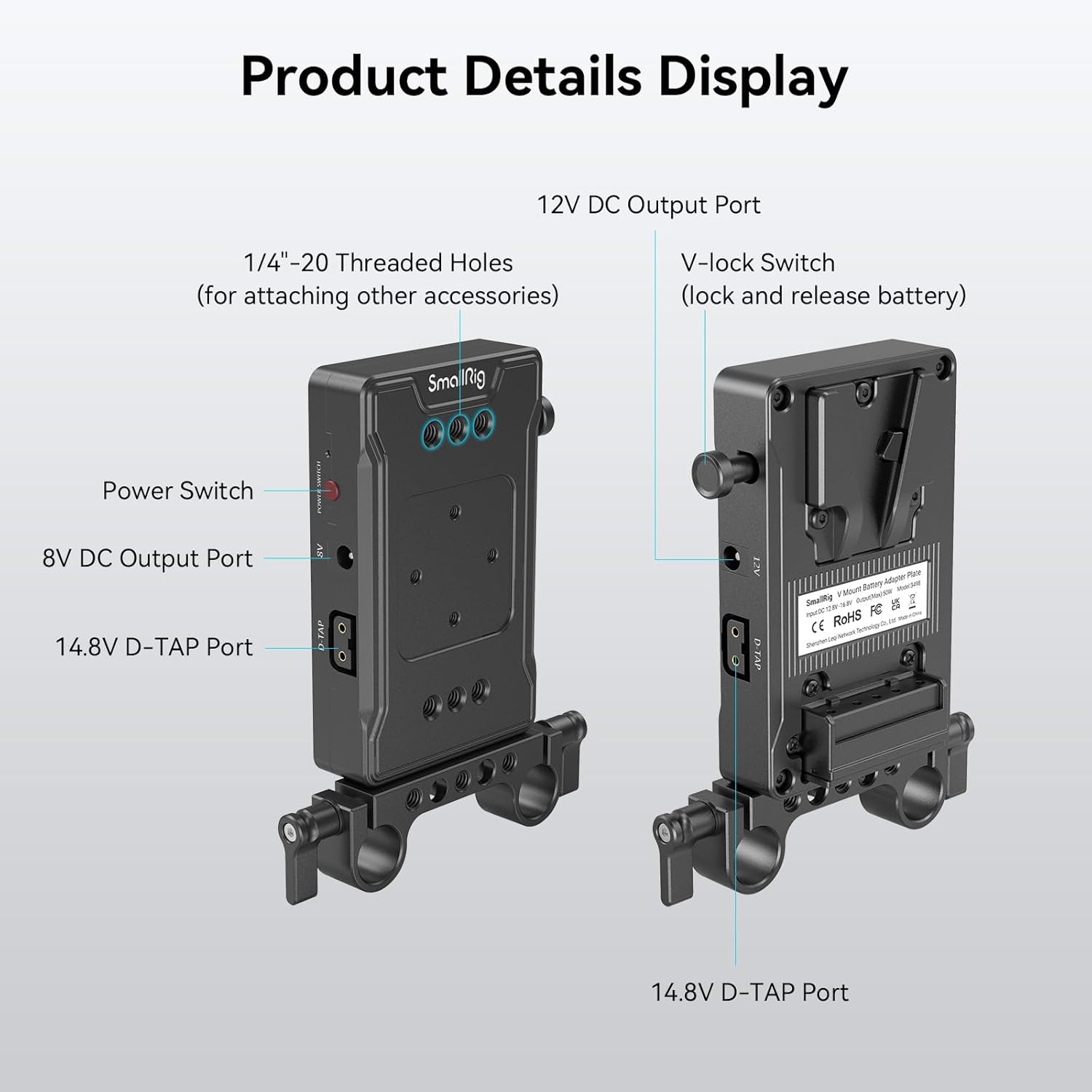 SmallRig V-Mount Battery Adapter, V-Lock Battery Plate with Dual D-TAP and DC Ports, 15 mm Rod Clamp and 1/4"-20 Threaded Holes, Compact for Cameras, Monitors - 3498