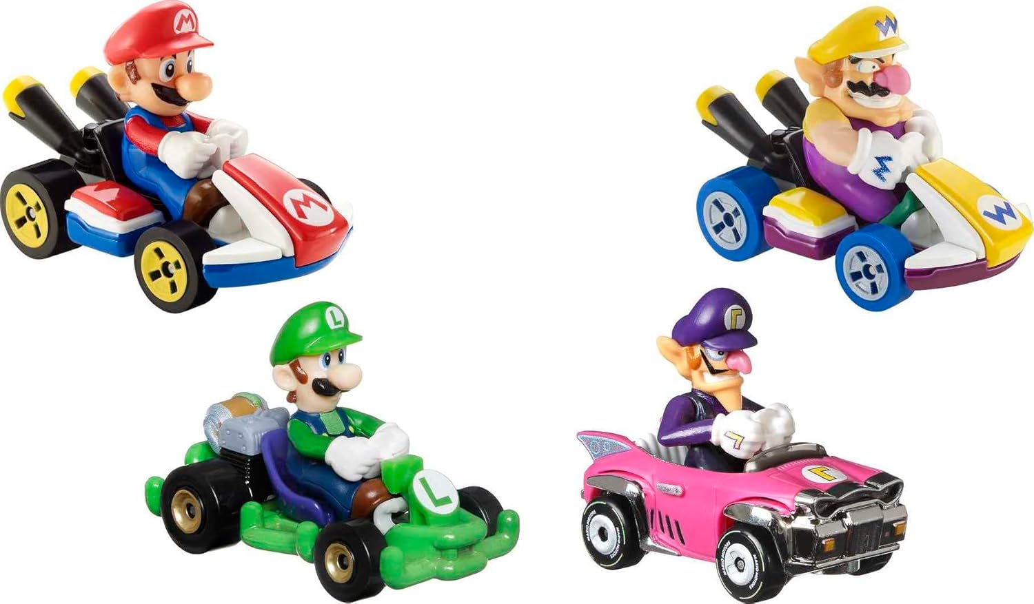 Paquete de 4 Vehículos Hot Wheels Mario Kart, Set de 4 Personajes Favoritos de los Fans Incluye 1 Modelo Exclusivo, Regalo Coleccionable para Niños y Fans a partir de 3 Años