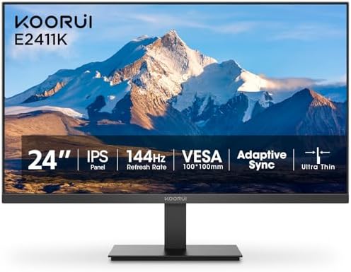 KOORUI 24 Inch Computer Gaming Monitor Full HD 1920 x 1080p 144Hz IPS Ultra-Slim Display with HDMI VGA, Adaptive Sync, 99% SRGB, VESA 100x100mm, Eye Care, Tilt, Black, E2411K