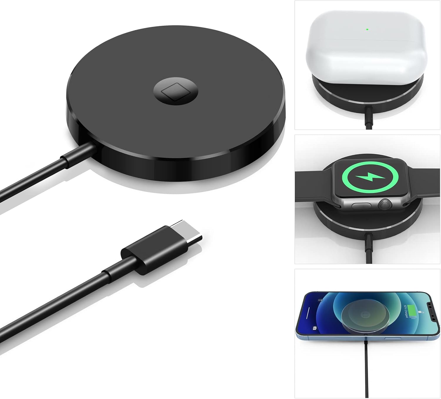 Cargador inalámbrico magnético, almohadilla de carga inalámbrica ikeer 3 en 1, USB-C rápido de 15 W (máximo) compatible con iPhone13/13 Promax /13Pro/13mini/12, para AirPods3/2/Pro/iWatch2/3/4/5/6/SE/7 y todos los dispositivos habilitados para Qi