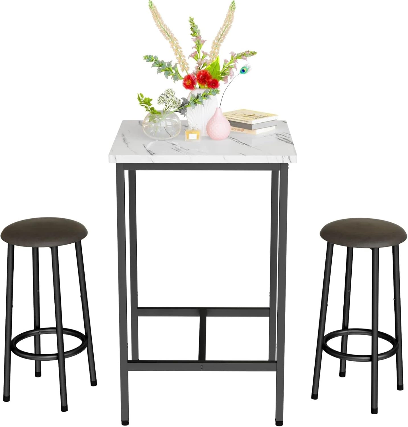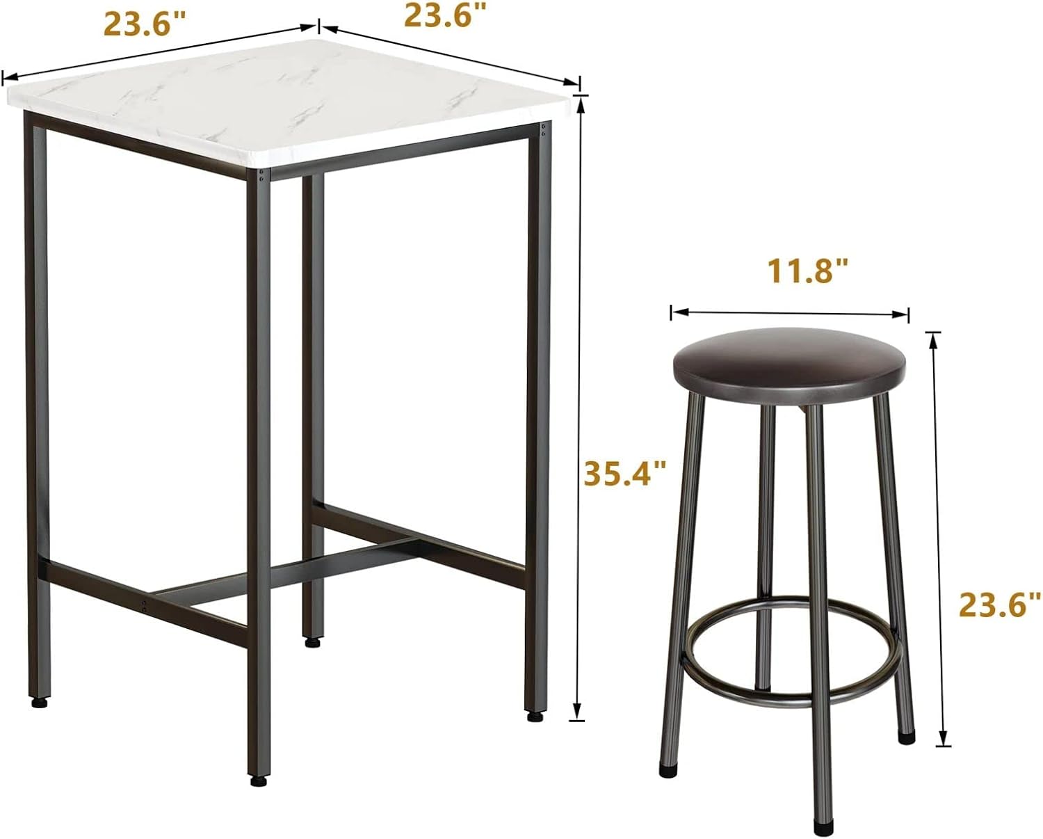 LinkRomat Bar Dining Table Set for 2 The modern and beautiful marble bar table with PU leather upholstered stools can be used as the finishing touch of your home style. It is not only a representative of beauty, but the spacious tabletop can also allow you to enjoy a delicious meal with your family. Our bar table set includes a bar table and two bar stools, you can place the stools under the table when you are not using it, it will not waste your space, it is very suitable for small apartments, bars, bistros, restaurants, Home bars, basements, dining rooms, living rooms and other small spaces. We provide two shapes of dining table for you to choose from, square and round to match different styles of home. The compact design of the dining table allows you to place it in any space and enhance the space decoration. Product Description Material: Steel + Faux Marble Bar Table : 23.62"L x 23.62"D x 36.22"H Bar Stools: 11.81"L x 11.81"W x 23.81"H Foot Pad Height: 10.62" Package include: 1 x bar table, 2 x bar stools Gross weight: 24.25 lbs Package size: 26.38" x 26.38" x 3.94"