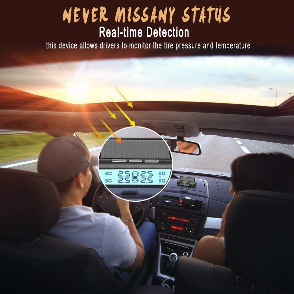 【SOLAR POWER & USB CHARGING】Our 4-wheel tire pressure monitoring system with 2 charging ways which ensure the tpms system will work continuously, the large area of solar panels above continue to supply energy in sunny days, saying goodbye to traditional wiring. USB charging cable (included) is available for all-weather use, realize full-time power supply and do not occupy the car cigarette lighter socket.