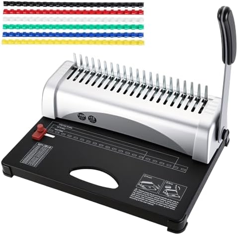 Package Included: 1 x 450 Sheet Comb Binding Machine; 60 x Black 3/8" PVC comb binding spines; 20 x White 3/8" PVC comb binding spines; 5 x Red 3/8" PVC comb binding spines; 5 x Green 3/8" PVC comb binding spines; 5 x Yellow 3/8" PVC comb binding spines; 5 x Blue 3/8" PVC comb binding spines
