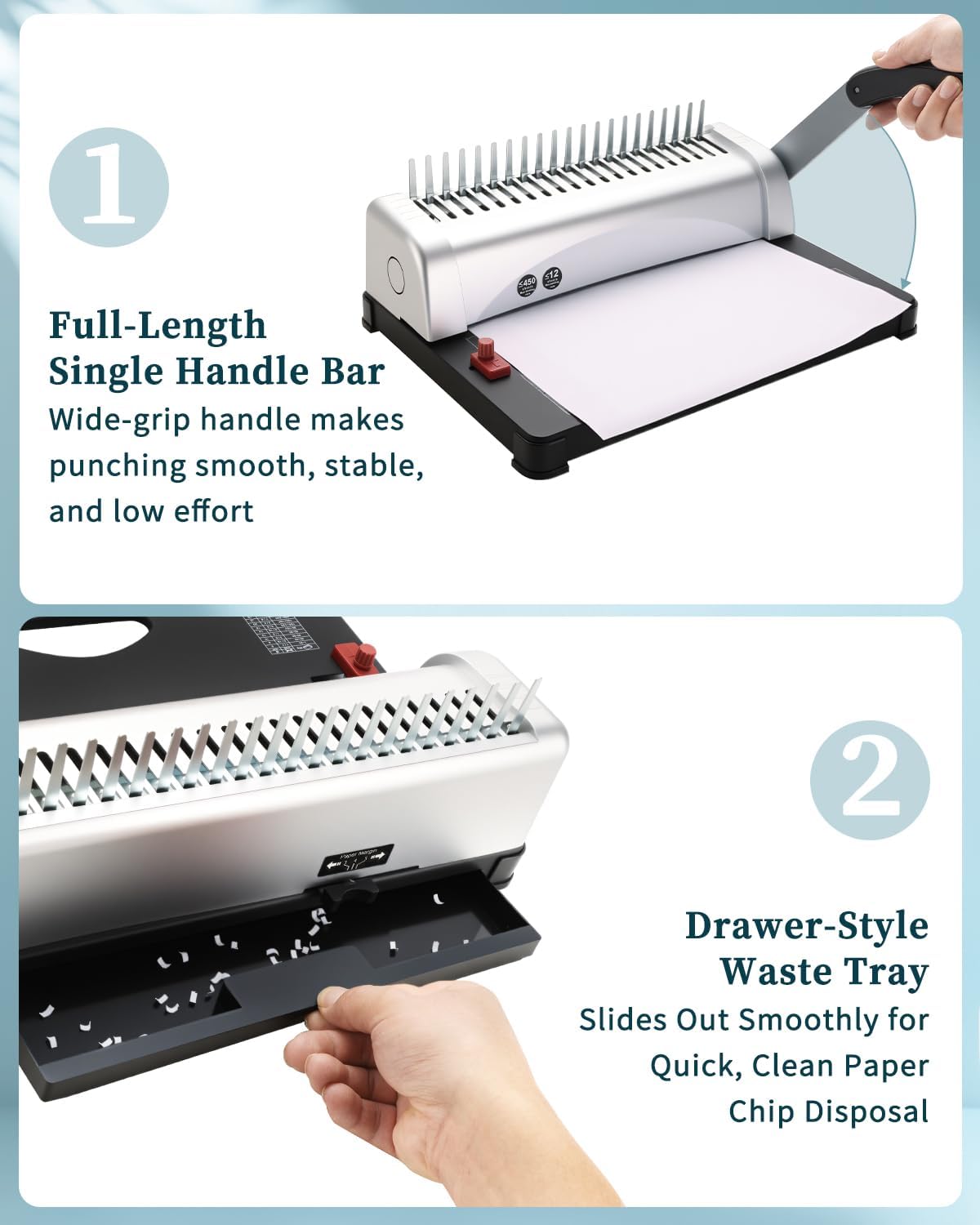 Single Handle Bar: The binding machine sturdy-grip handlebar allows you to punch holes in your documents easily. Simply apply steady pressure to punch holes in up to 12 sheets of paper at a time. Time-saving & Labor-saving, the best assistant helping you punch and bind your reports, documents, proposals, essay papers efficiently
