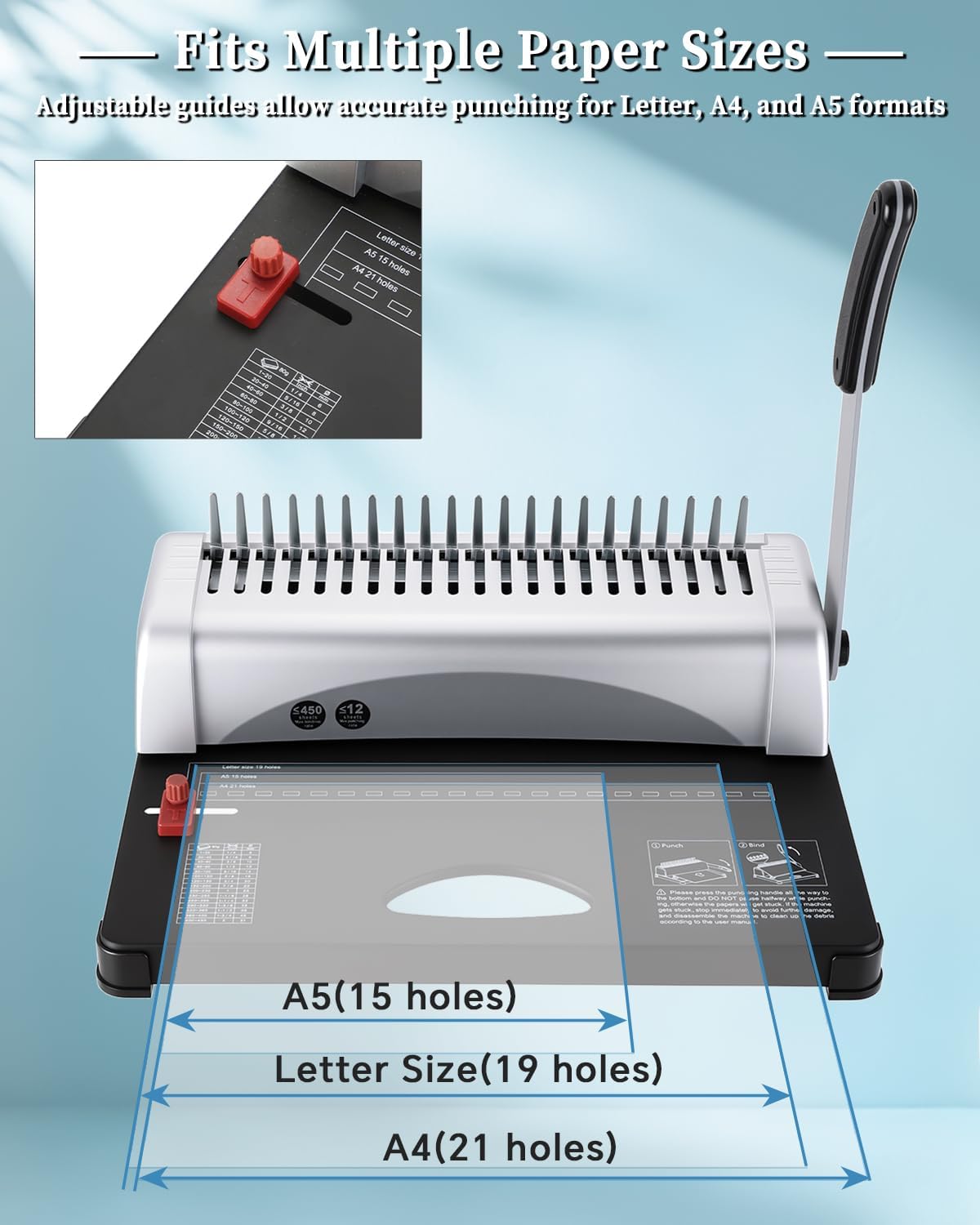 Wide Application: Our binding machine has side and depth margin adjustments, so you control where the holes are punched on paper of any size. The comb binding machine is suitable for Letter Size (19 holes), A4 Size (21 holes), A5 Size (15 holes).