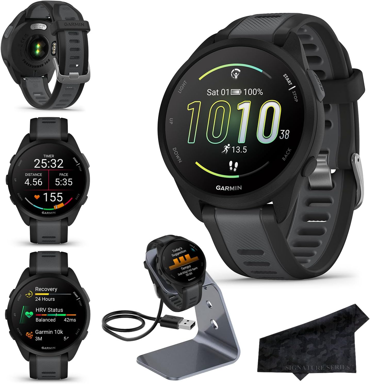 Garmin Forerunner 165 GPS Running Smartwatch, Black/Slate Gray, Advanced Health and Fitness Insights, Sleep Coach, Training Plans, Garmin Pay, Signature Series Charging Stand Bundle