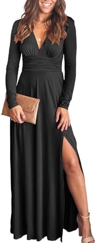 ANRABESS Women's Deep V Neck Wedding Guest Maxi Dress: 2026 autumn-winter wedding essential, slim fit (S-XXL).​ Material - 95% polyester + 5% spandex with double lining: medium stretch, softness and thickness for sleek, comfortable fit—elegant for weddings.​ Deep V-neck, floor-length cut, side slit and long sleeves, with pleated high waist and smocked back. Perfect for wedding guest looks, cocktails and formal events—must-have for fall-winter weddings.