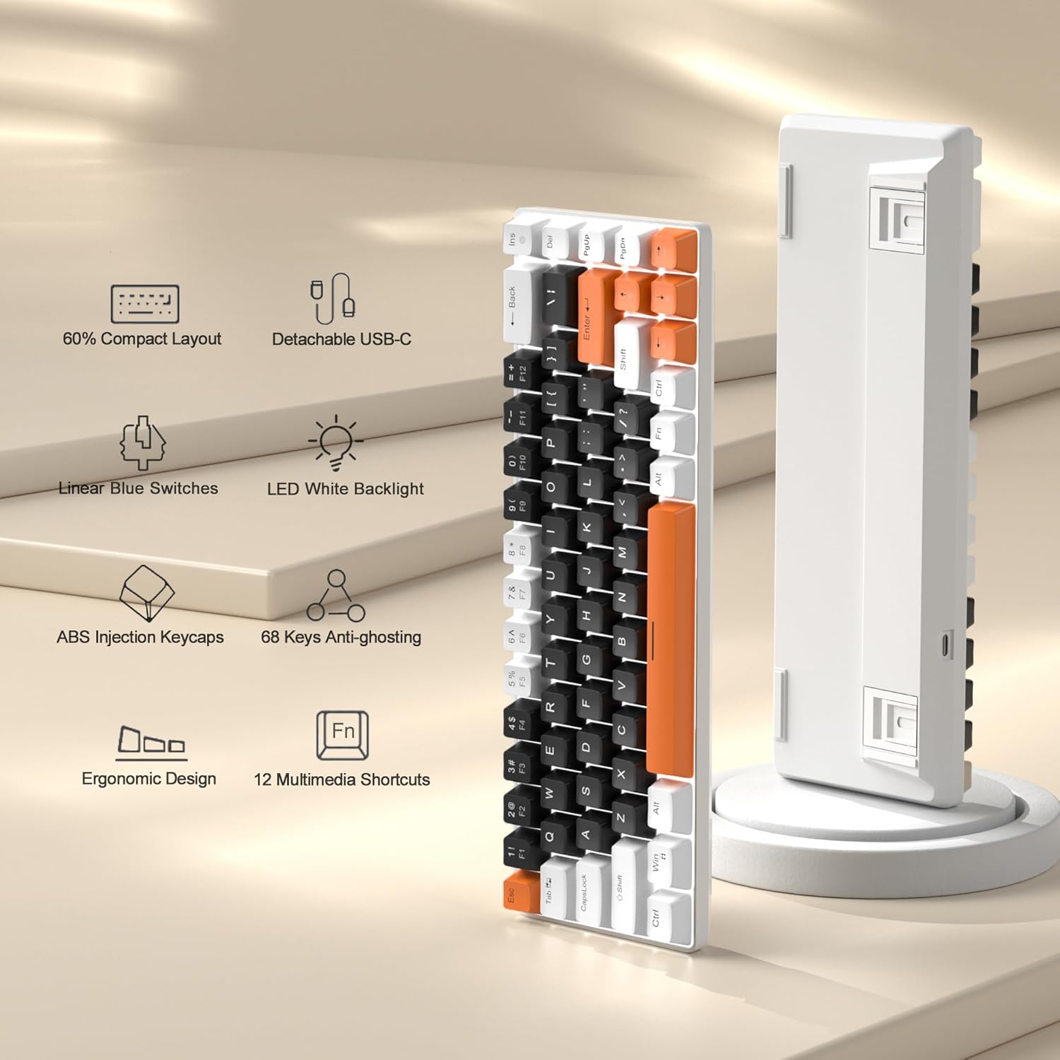 Teclado antifantasma completo: todas las 68 teclas no tienen conflicto, diseño de mezcla negro blanco naranja, teclas de inyección de doble color con suspensión ergonómica, dobles pies de soporte para ajustar el ángulo de escritura y cable USB desmontable, tanto práctico como hermoso.