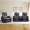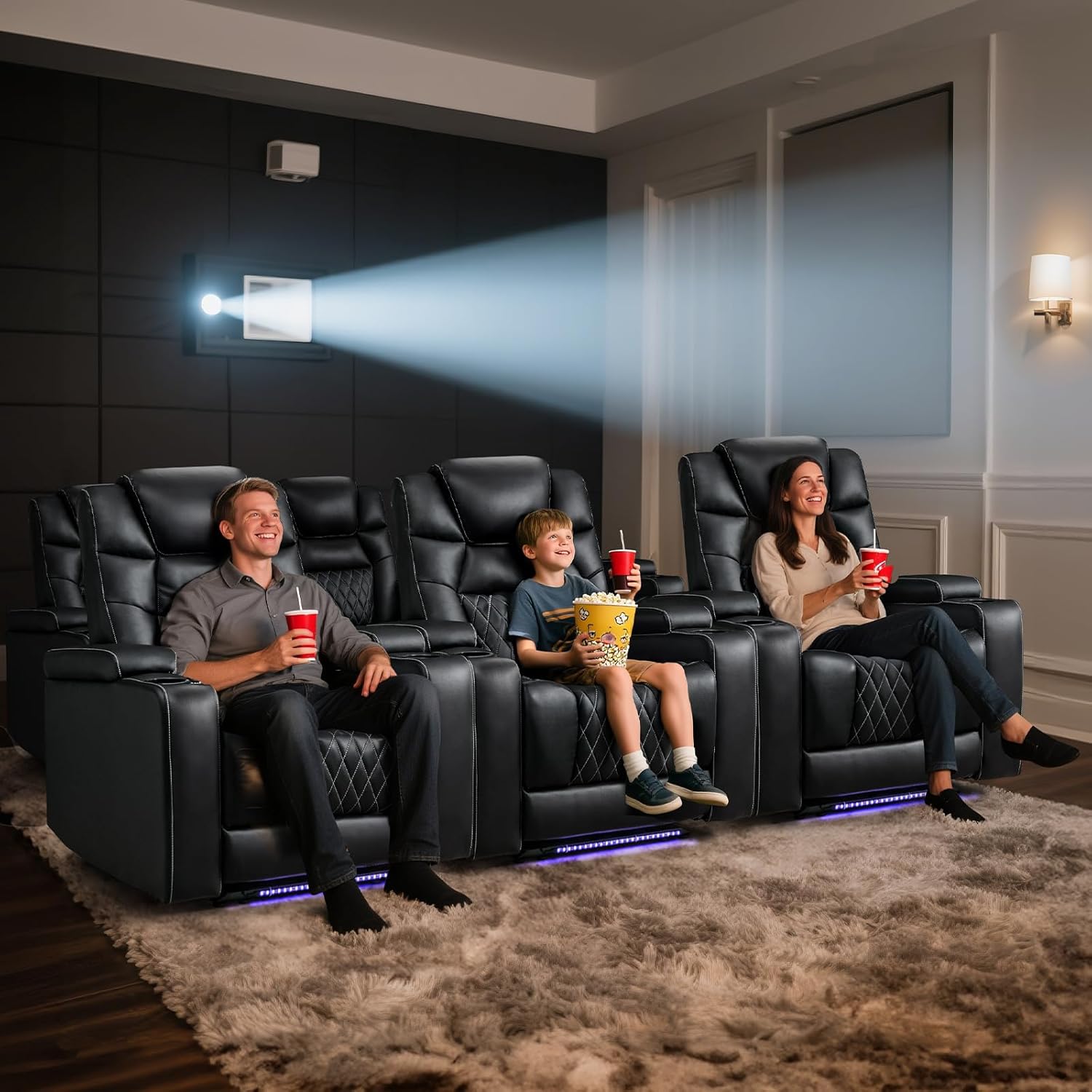 ANJ PU Leather Recliner Chair, Power Movie Theater Chairs with USB Port, Electric Home Theater Seating for Media Room with Blue Ambient Lighting, Hidden Arm Storage, Cup Holders (Black)