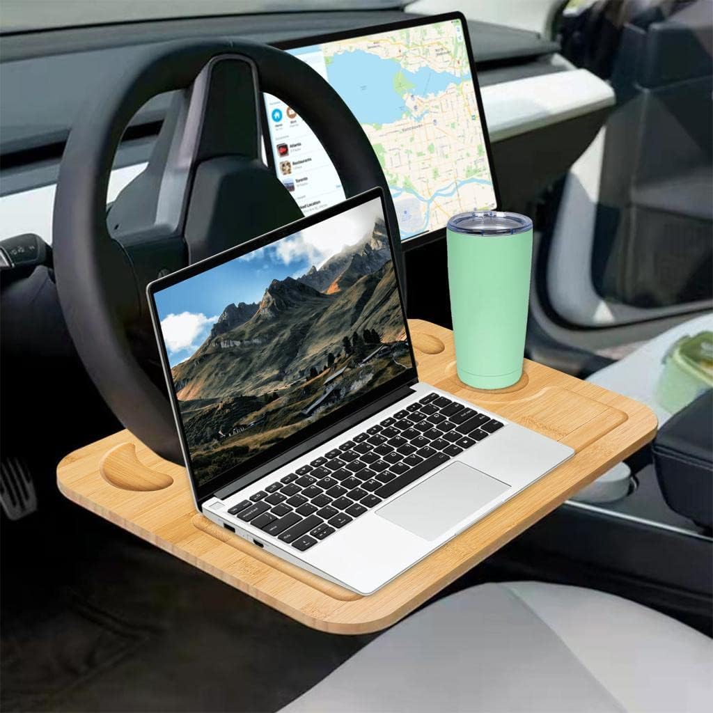 lebogner Steering Wheel Tray, Car Tray for Eating, Hook On Steering Wheel Desk for Food, Laptop and Car Accessories, Car Road Trip Must Haves Gadgets Car Table (Bamboo Wood)