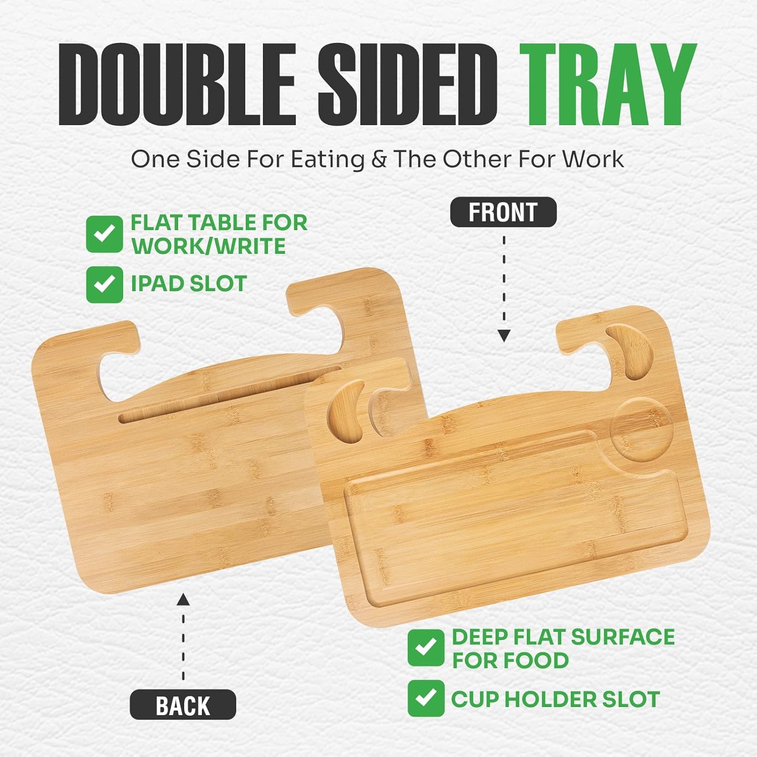▶ Supreme Design - Our 2-Sides Steering Wheel Desk hooks onto the bottom of the steering wheel, creating an ergonomic table. One side is for food with a deep, flat surface and cup holder, the other is for work with a flat table and pen slot.