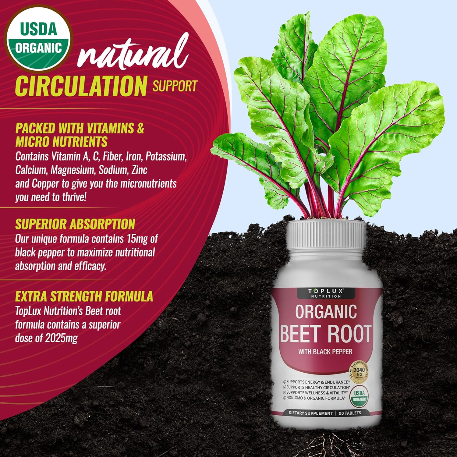 Organic Beet Root Powder Tablets - 2040mg Natural Nitric Oxide Beets to Support, Energy, Black Pepper Better Absorption, Non-GMO, for Men Women, 90 Tablets