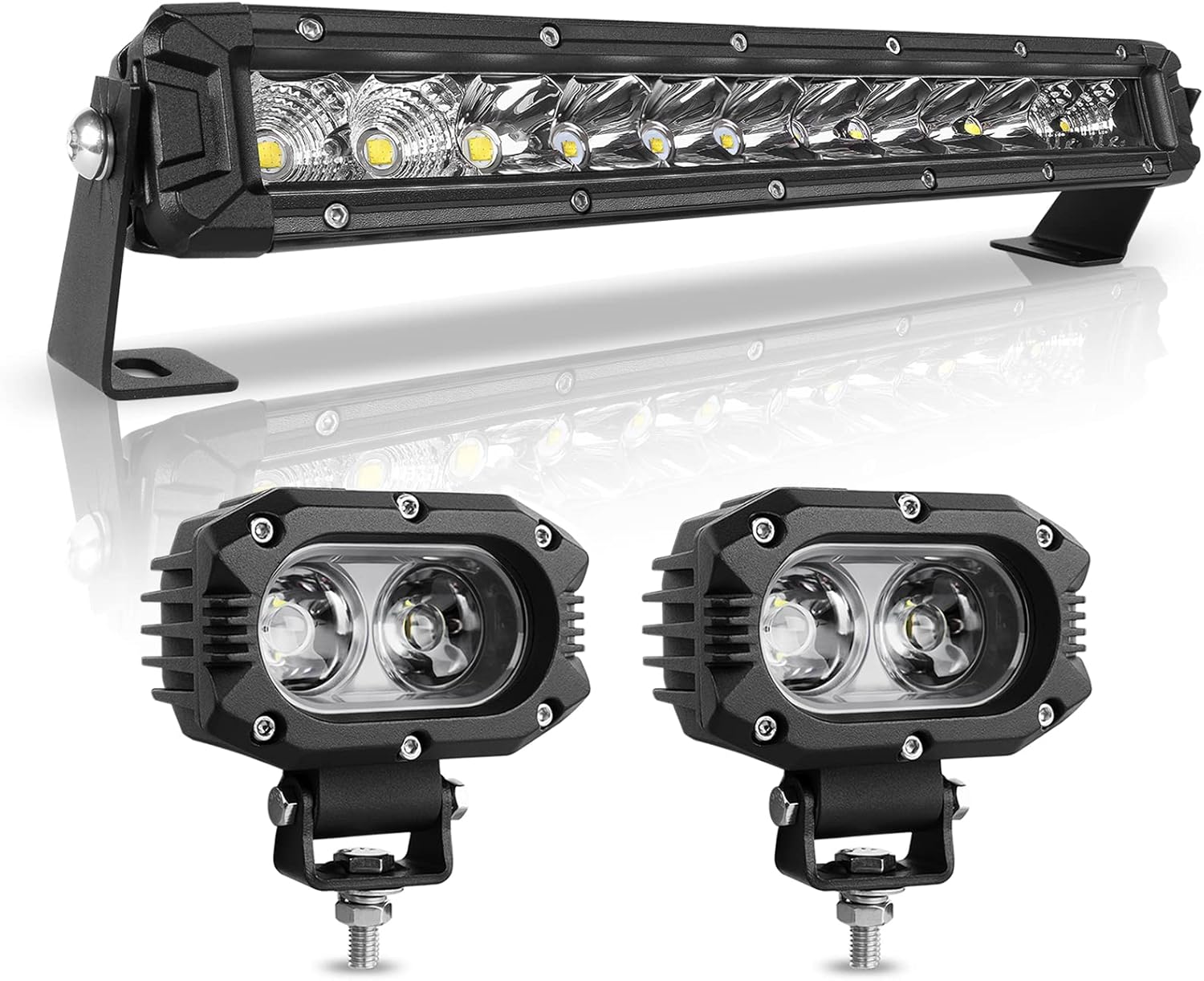 *SUPER LIGHTING: 8D reflective cup lens, provide more concentrated soft light beam and further irradiation distance. Both sides have special flood Reflective cup which makes the irradiation area compared to ordinary 1 Row led light bar more extensive, improve the safety of night driving.