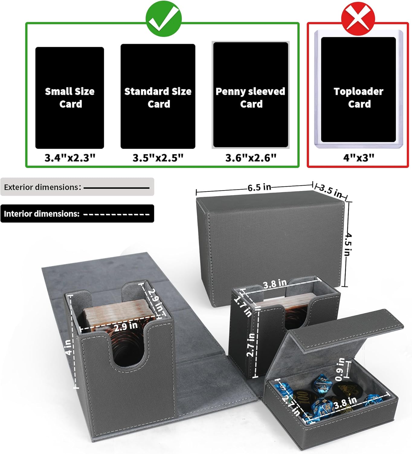 HIGH CAPACITY∶The upgrade 200+ card deck box, can hold more than 100 double-sleeved cards, 200+ single- sleeved cards, 300 + unsleeved cards. Due to the thickness of sleeves, the actual number of cards that can be holded varies.