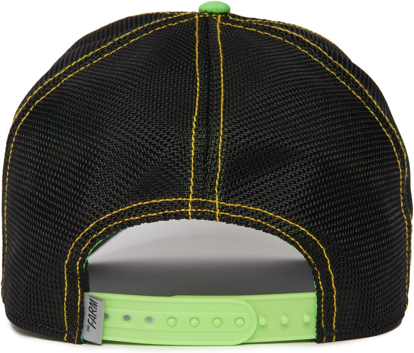 Classic trucker hat silhouette featuring dayglo pop colors and over black.
