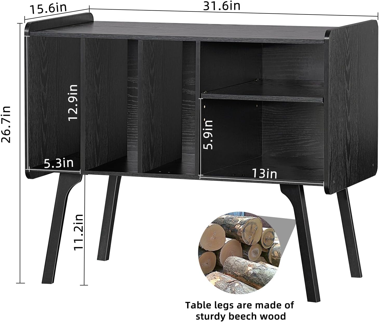 Lerliuo Record Player Stand with 4 Cabinet Holds Up to 220 Albums, Large Black Turntable Stand with Beech Wood Legs, Mid-Century Record Player Table, Vinyl Holder Storage Shelf for Bedroom Living Room