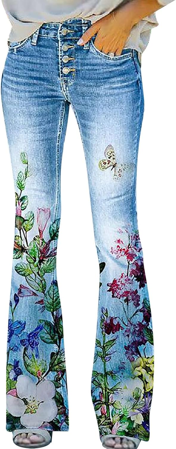 Quealent Jeans for Women Flare Jeans Stretch Denim Leggings Floral Print Casual Bell Bottom Jeans Bootcut Denim Pants