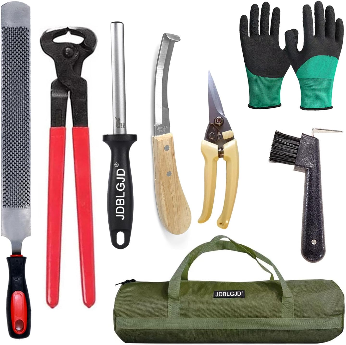 【Farrier Tool Kit】Farrier hoof tool kit, which includes Goat Hoof Trimmers,Hoof Knife Sharpener,goat hoof rasp file,Farrier Hoof Nippers, hoof knife, horse hoof pick, a pair of high-quality gloves, and a thickened tool bag. All tools are made of high-quality materials to ensure durability and sharpness.This kit is not only perfect for trimming horse hooves but also suitable for cow and goat hoof trimming.