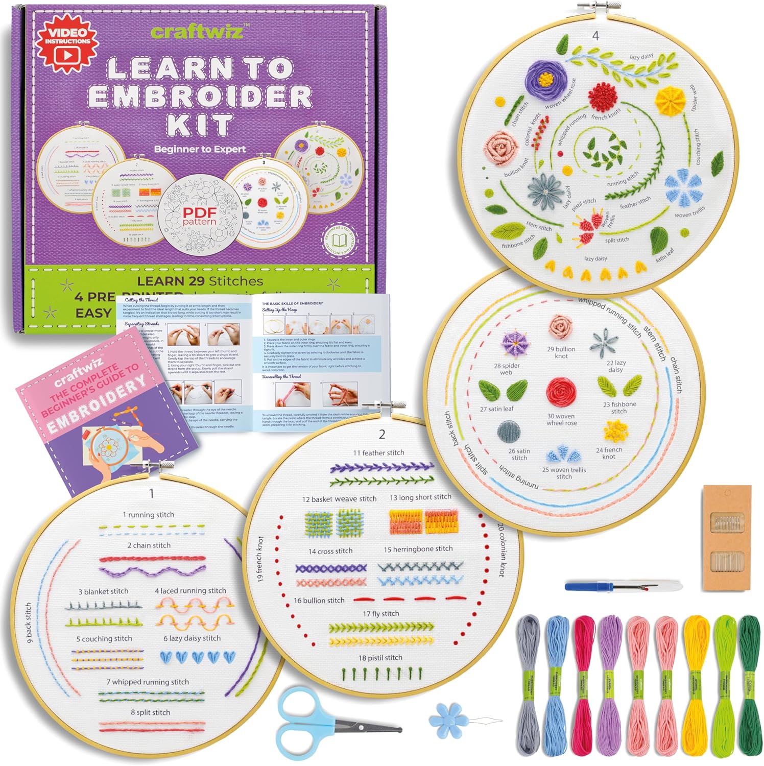 Craftwiz 4-Piece Starter Embroidery Kit for Beginners and Expert with Simple Patterns, Learn 29 Stitches with Hand Embroidery Kit
