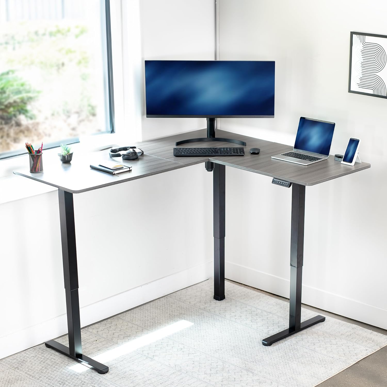 Create Instant Active Standing: Go from sitting to standing in one smooth motion with this complete corner workstation providing comfortable viewing angles and customized user heights. Perfect for a corner desk or office space divider. --Patent Pending--
