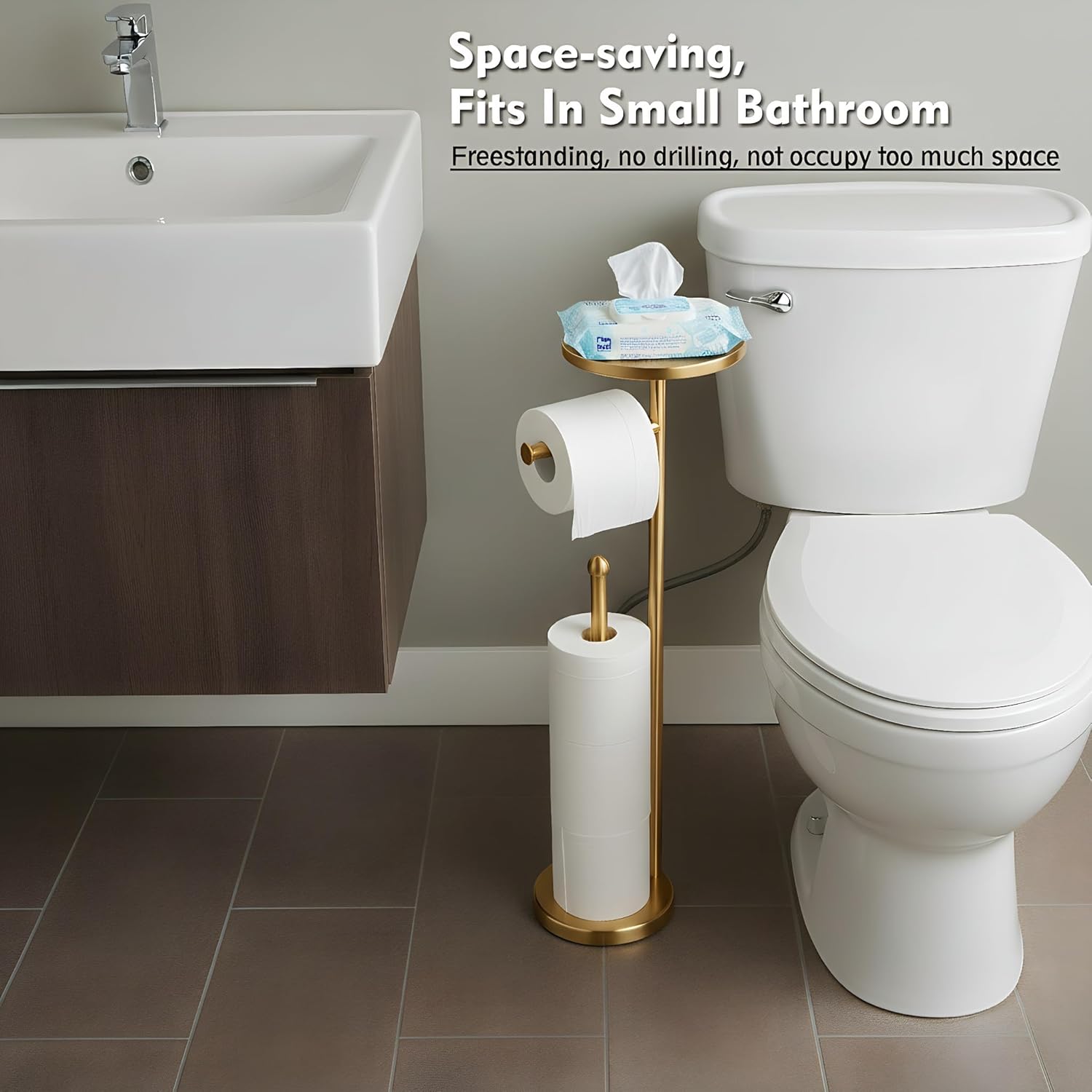 Freestanding, easy to assembly, no drilling holes on the wall, easy and convenient to use. The brushed gold finish bathroom tissue holder can perfectly match your bathroom fixtures. The dimension of toilet roll holder is diameter 8” x height 26”. Works perfectly in any big or small bathroom.