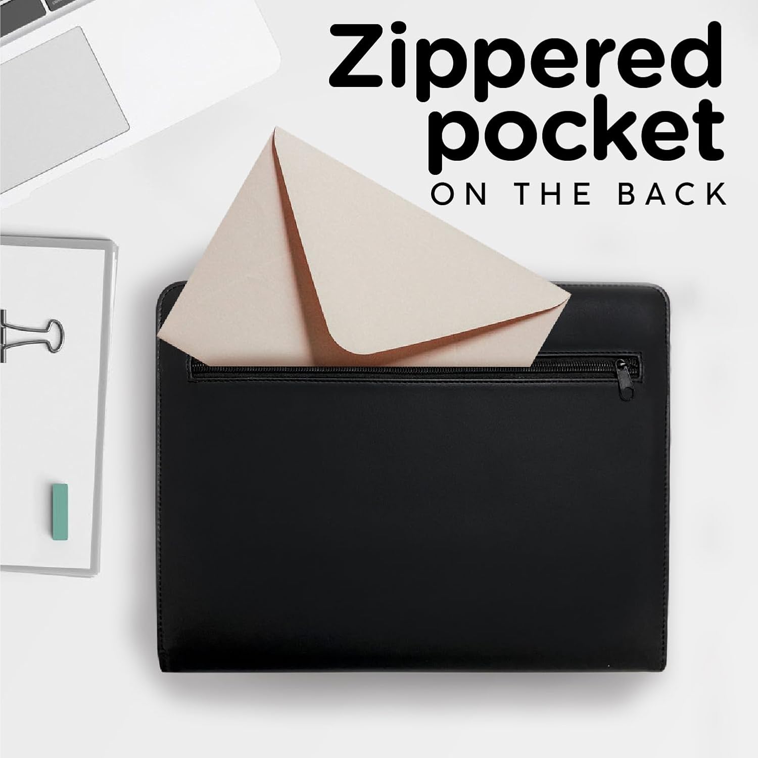 [THE PADFOLIO INCLUDES]: Our portfolio has a beautiful and elegant design with 4 card holders, a cellphone sleeve, 2 wide document pockets, earphone cable holder, tablet sleeve, A4 clipboard, pencil holder, zippered outside pocket, and a secure buckle closure. Boost your professionalism with our faux leather portfolio. Stay organized and experience functionality with style!