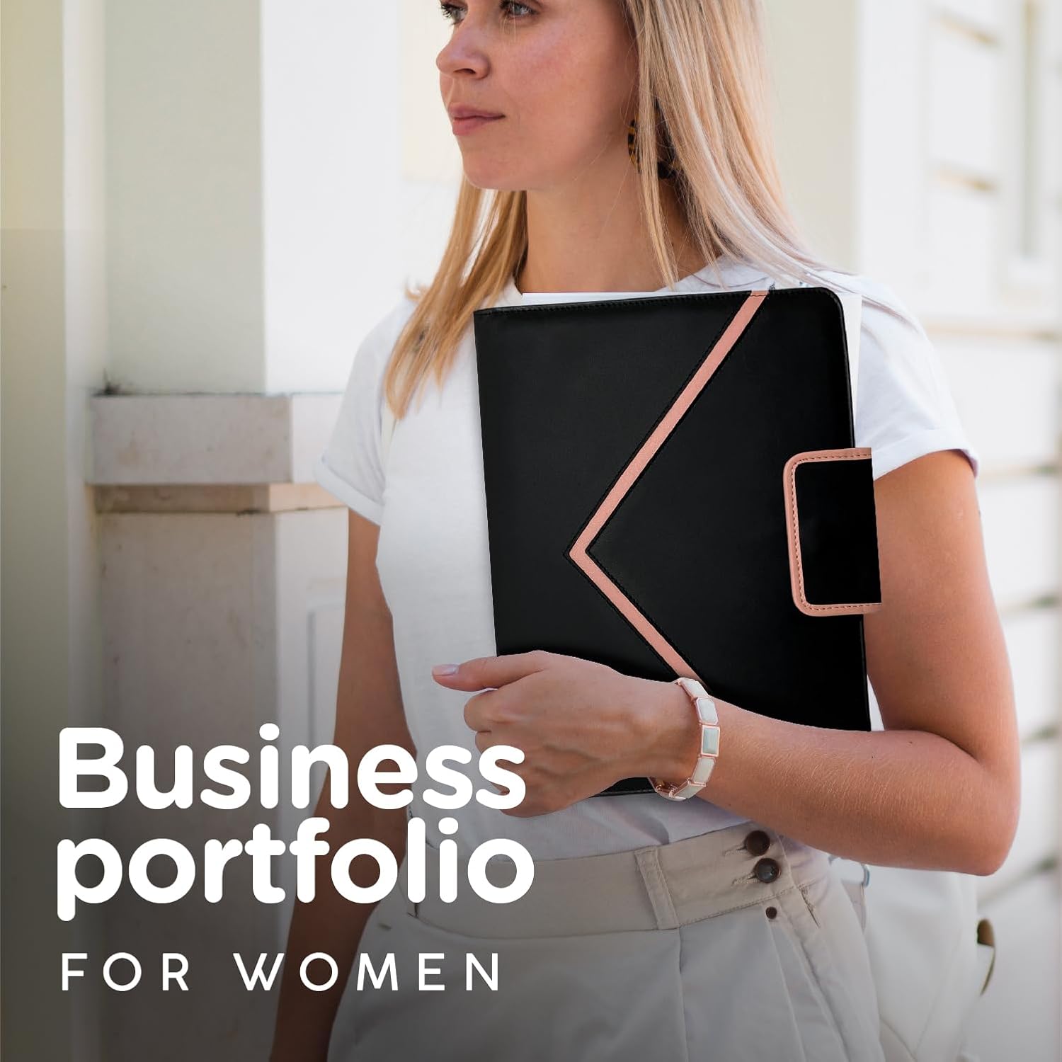 [CAPACITY & DURABILITY]:When you acquire our legal pad holder, you'll experience unparalleled durability and unmatched quality.The elegant black and pink design of the business portfolio for women adds a touch of sophistication.Compared to the rest of the competition,our product features top quality material resistant to fingerprints, keeping it pristine.The clipboard securely holds your notepad