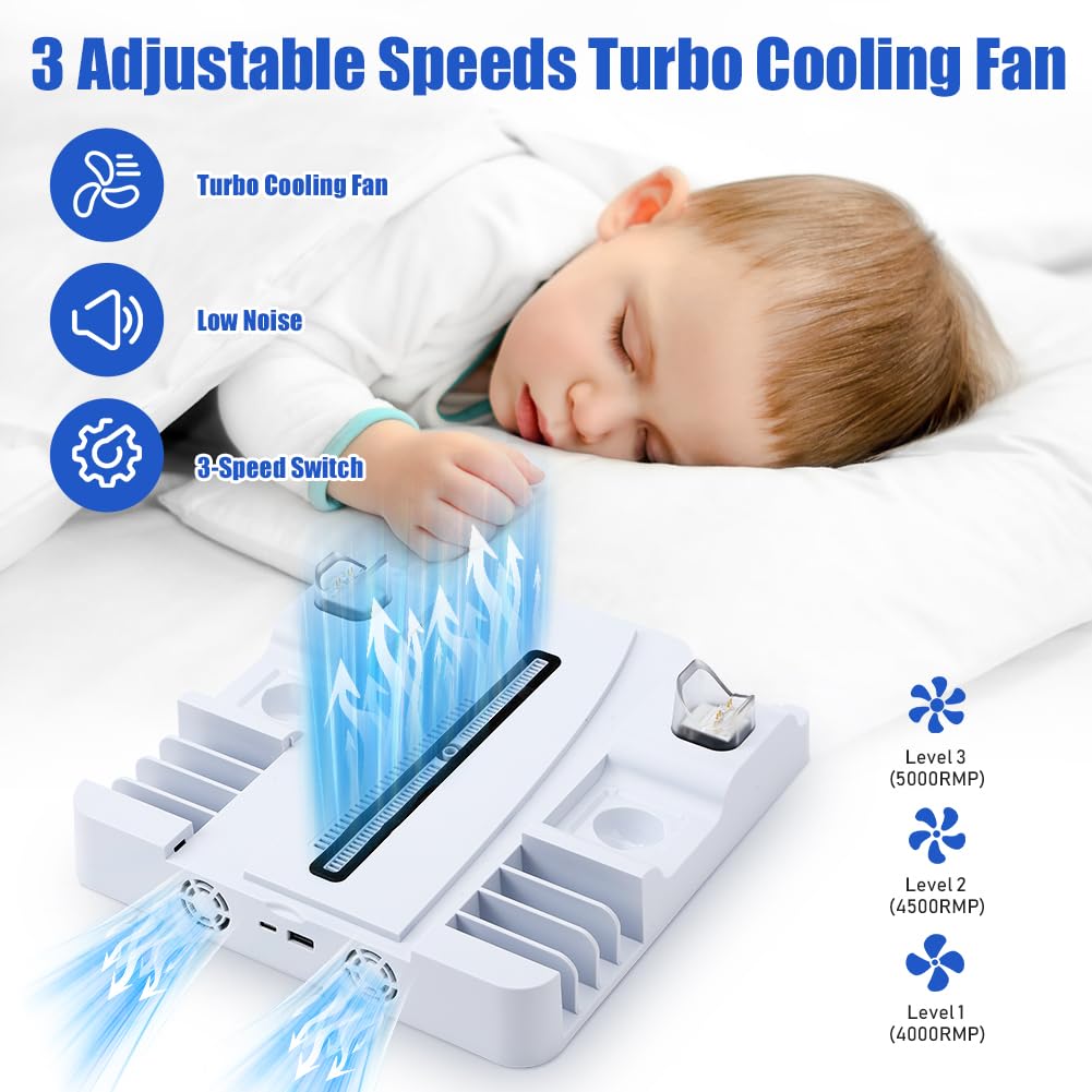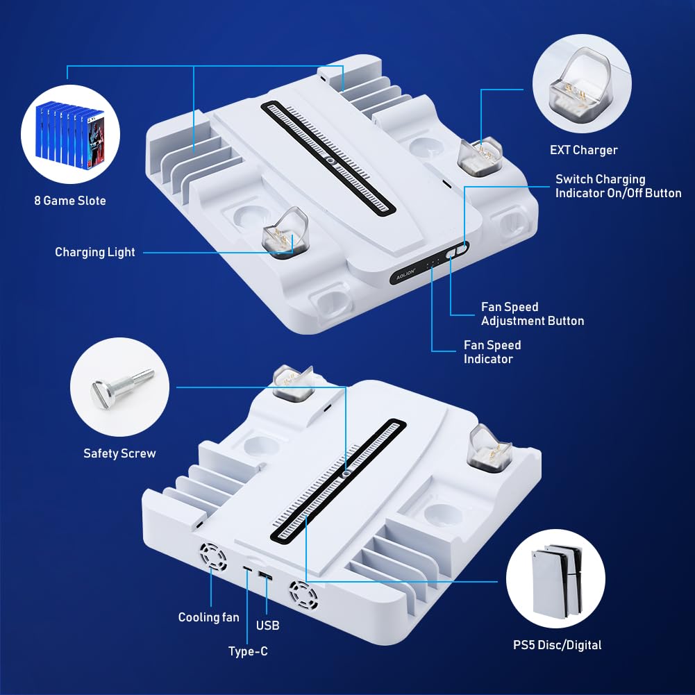 The PS5 Slim Cooling Station is a must-have accessory for PS5 Slim users. The Cooling Station has a built-in cooling fan with 3 speed settings to ensure your console stays cool even during intense gaming sessions. The Cooling Station also comes with a controller charging station that can charge 2 controllers at the same time and is compatible with DualSense controllers and DualSense Edge controllers for a wide range of applications. The charging station also provides ample storage space for PS5 Slim game cartridges, keeping them organized and easily accessible.With its sturdy construction and easy-to-use design, the PS5 Slim Cooling Station is the perfect accessory for PS5 Slim users. Features: 1.Configure 2 panels for the PS5 console and the new console PS5 Slim, compatible with Playstation 5/Slim console digital and disc versions 2.The charging station for PS5 slim equipped with dual controller charging port can charge for DualSense controllers, also for DualSense Edge controllers. 3.The PS5 cooling station has a 3-speed fan with a low-noise design. Press the fan button to adjust the speed in the "1-2-3" cycle. 4.Only need about 2-3 hours to fully charge 2 PS5 controllers. The LED indicator of PS5 charging station is clear. Red light: charging; Blue light: fully charged/standby. 5.USB and Type-C ports are convenient for you to input and output power. 6.PS5 slim stand can hold up to 8 PS5 game cartridges, can help you to organize and store game discs to avoid loss or confusion. 7.The non-slip rubber design on the bottom keeps the vertical support stable and tight. Specifications: Color:White Material: ABS Input Current: 0A-3A Input Voltage: 5V Charging Time: 2-3 hours Handle Charging Current: 0-900mA x 2 Package Includes: 1x Multi-function Fan Base for PS5/PS5 Slim 1x Charging Cable