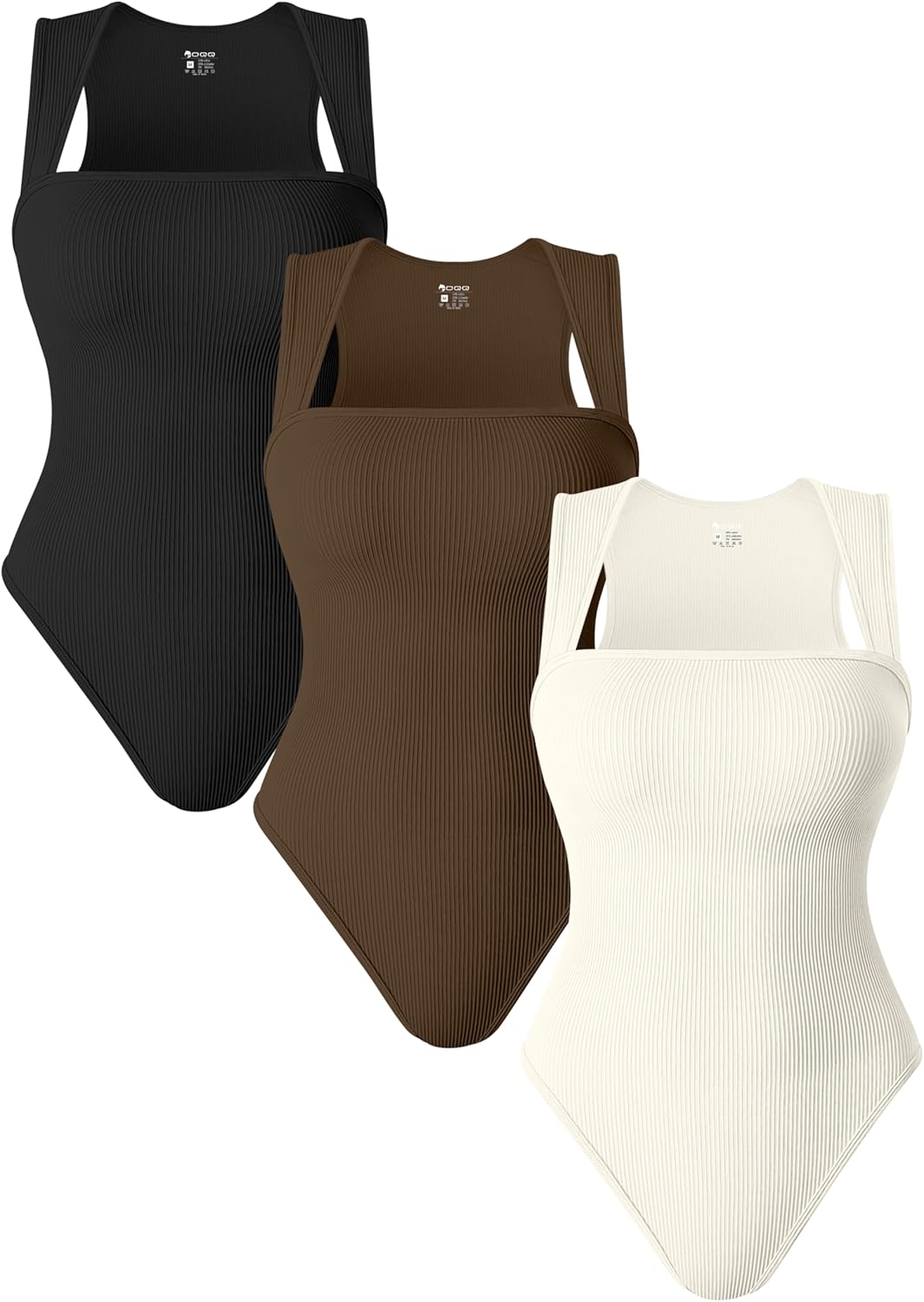OQQ 3 Piece Bodysuits For Women Sexy Ribbed Strappy Square Neck Stretch Tank Tops Bodysuits Black Coffee Beige