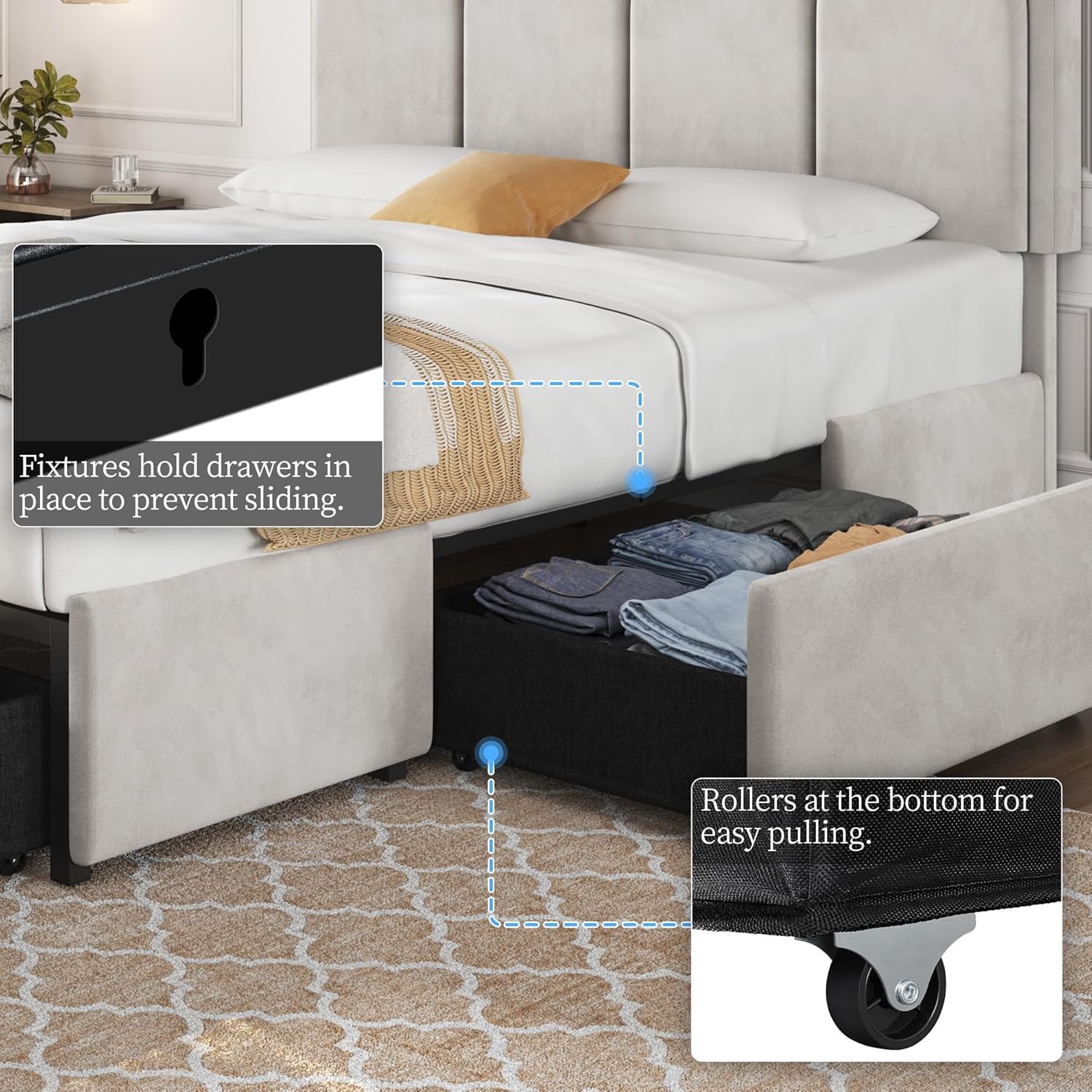 Slide In/Out Drawer: Two big drawers and two small drawers are all equipped with rollers for easy access sliding in and out under the bed. Four storage drawers to store your seasonal beddings and linens and a host of other personal essentials, creating a clean and tidy look.