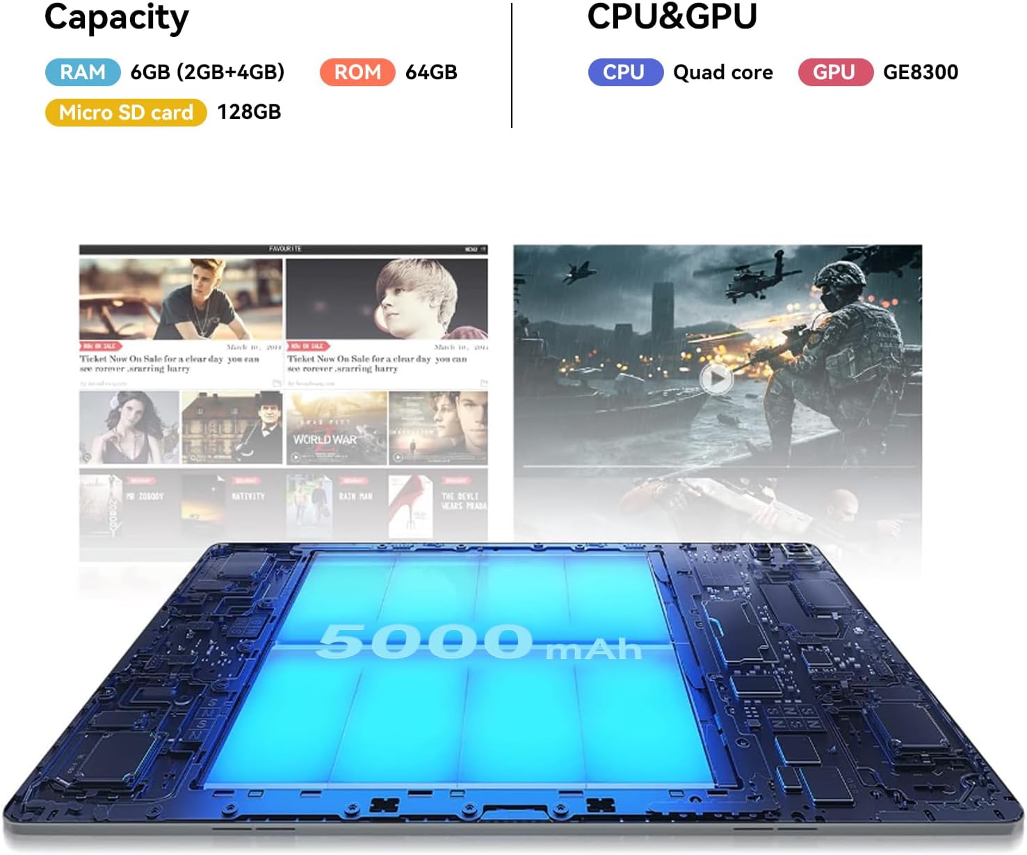 MB1001 10 inch Android 13 Go Tablet, 6GB RAM, 64GB ROM, 128GB Expansion, 5000mAh Battery, WiFi, Bluetooth, 5MP+8MP Dual Camera (Silver)