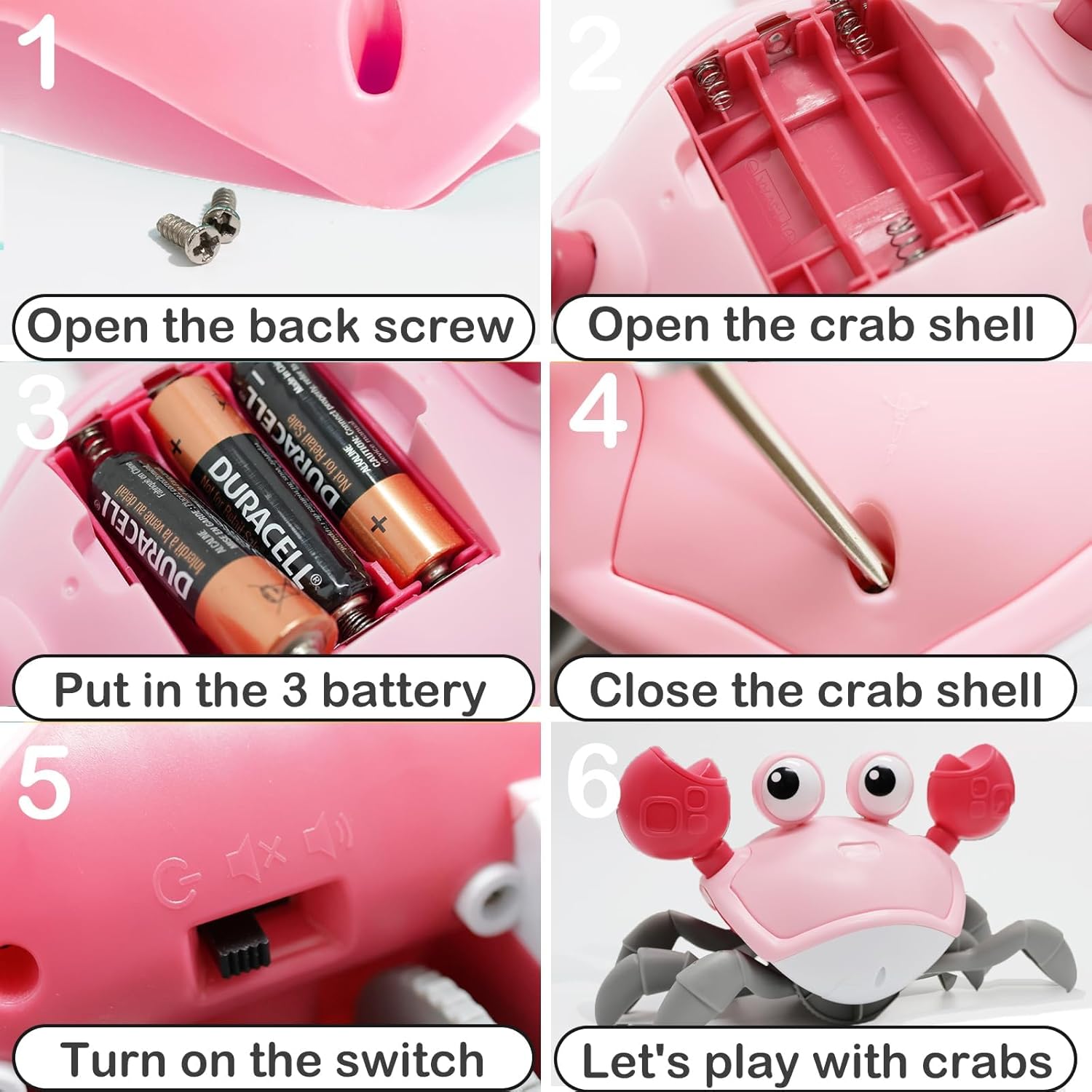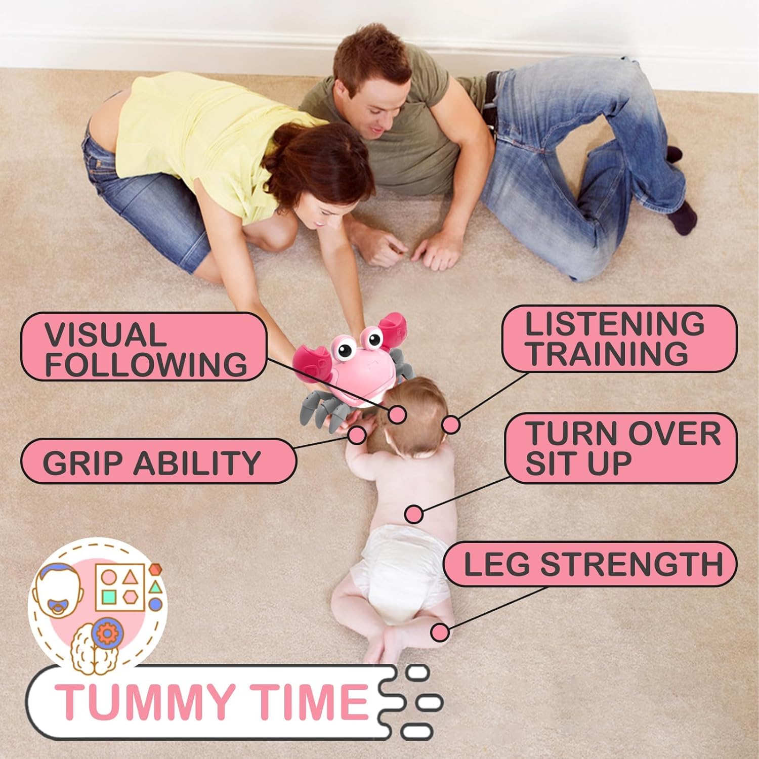 Crawly Crab Baby Toy: Moves briskly, mimicking the sideways scuttle of a real crab, while playing entertaining music(with mute button). The built-in sensor makes it avoid nearing obstacles, attract babies to crawl towards it but never catch it, hugely satisfying the baby's sense of exploration