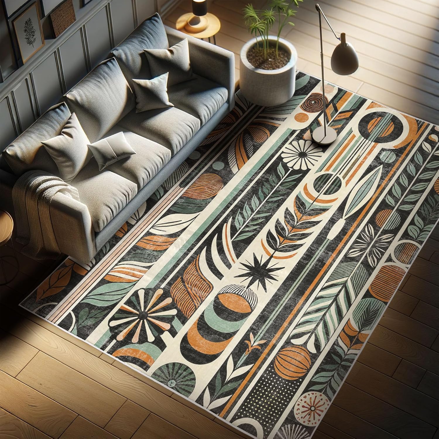 Ambesonne Boho Decorative Rug, Bohemian Leafy Details Asymmetric Botanical and Mid Century Modern Elements, Quality Carpet for Bedroom Dorm and Living Room, 4' X 5' 5", Pale Teal Dark Orange