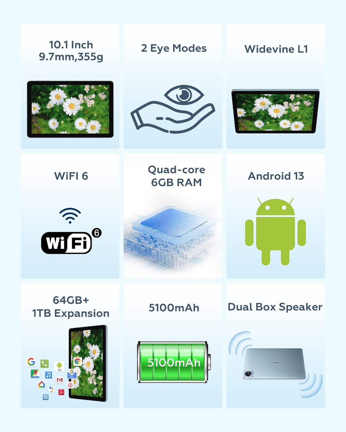 ⭐【 6GB +64GB +1TB Storage】Blackview android 13 tablet provides the new Memory Expansion Technology that extends the 2GB RAM to up to 6GB, giving you an edge to open more apps simultaneously and switch between different apps with ultra-smoothness.With 64GB of internal storage,offering enough room for all your files ,getting 1TB space with Micro SD card .