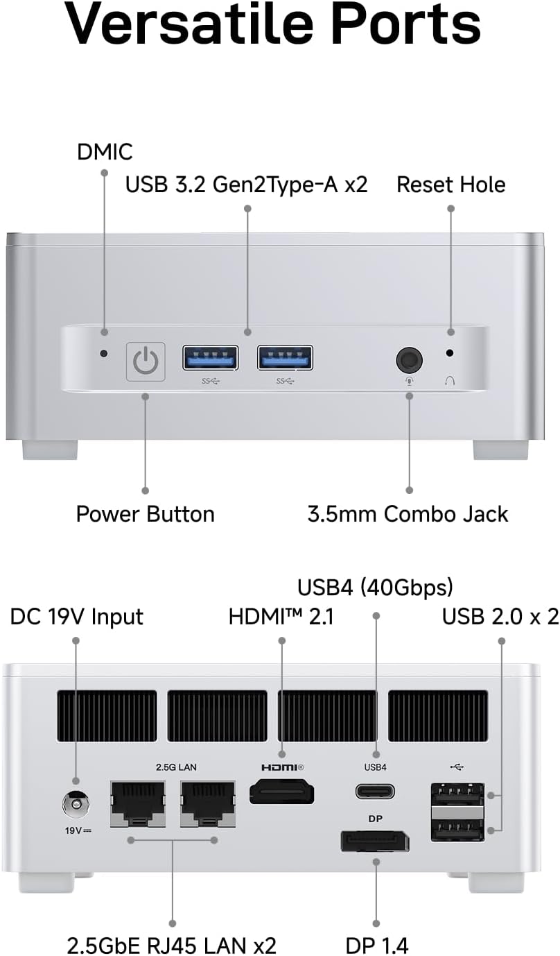 【Comprehensive I/O Options】The M1 Plus Mini PC offers a wide range of connectivity options, including 1x HDMI2.1 Port, 1x DP1.4 Port, 1x USB4 Port, 2x USB3.2 port, 2x USB2.0 port, 2x 2.5G LAN ports, 1x 3.5mm audio jack, 2x DDR5 SODIMM slots. This versatile array of ports accommodates a multitude of peripherals and external devices, ensuring maximum flexibility and convenience.